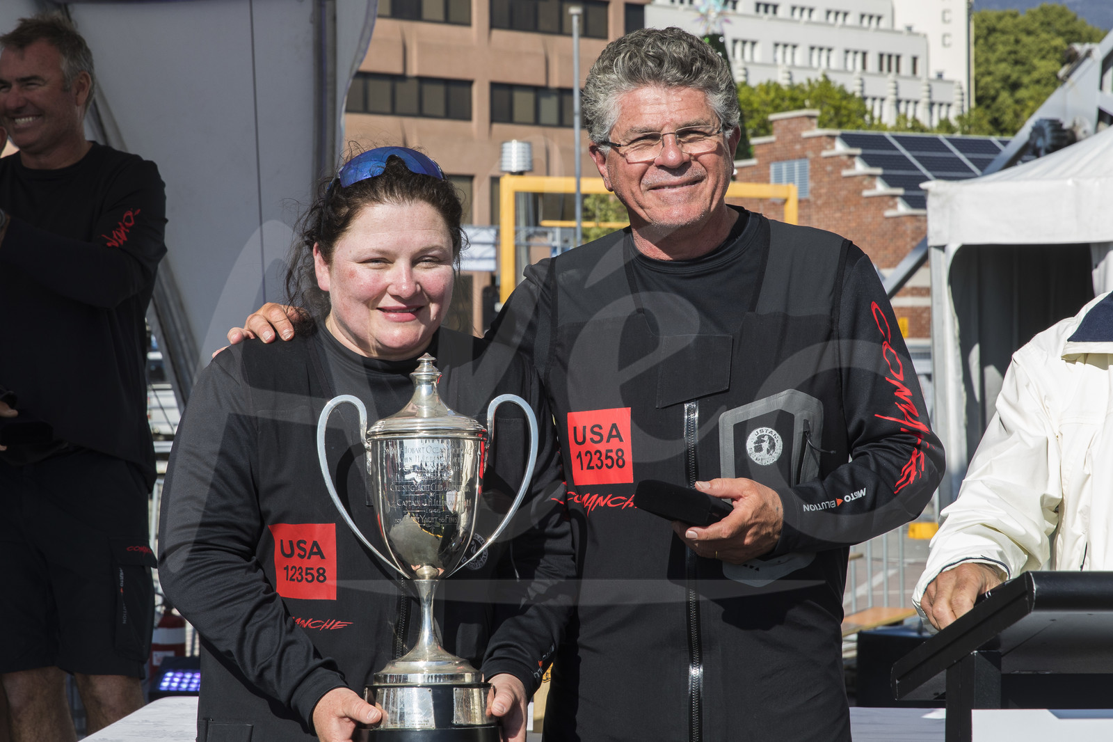 | Description | HOBART, AUSTRALIA - DECEMBER 28: Maxi yacht Comanche owners Jim Cooney and Samantha Grant lift the trophy after winning the 2019 Sydney to Hobart race on December 28, 2019 in Hobart, Tasmania, Australia. (Photo by Andrea Francolini/Alea) |