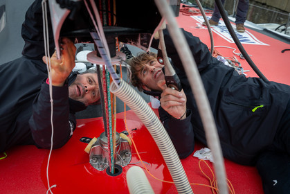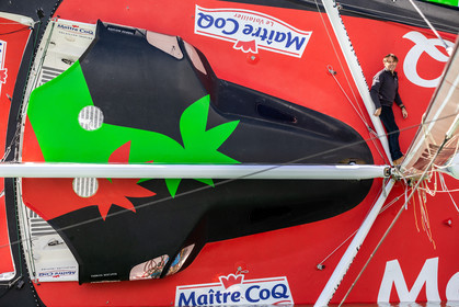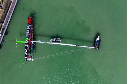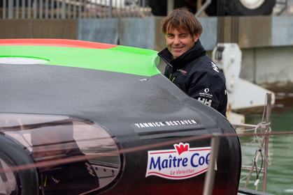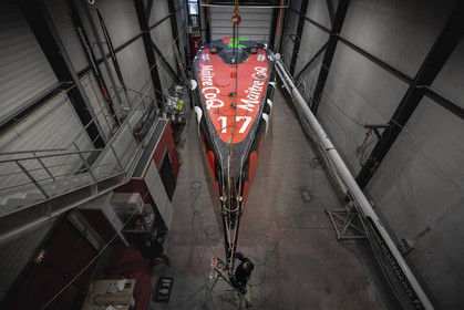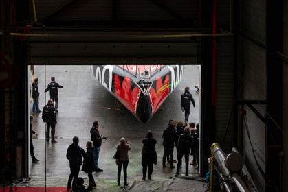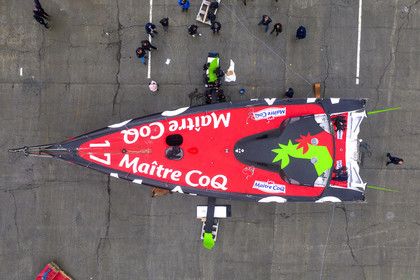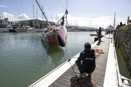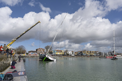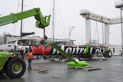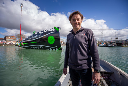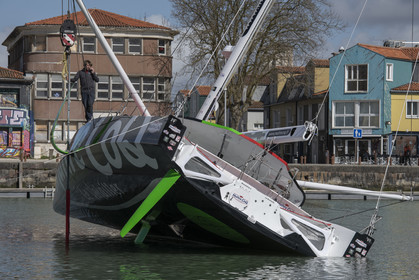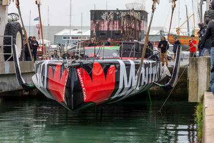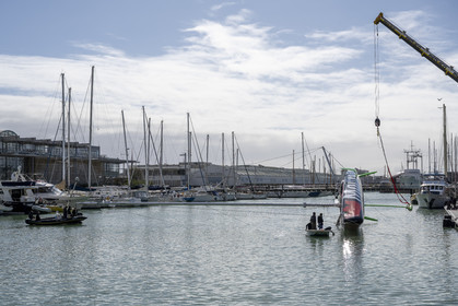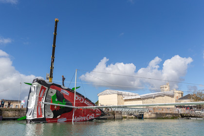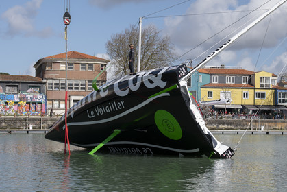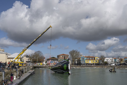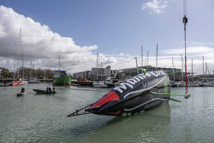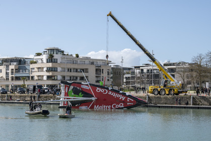 Selection d'images de la mise à l'eau et du test de redressement à 90° du voilier Imoca Maitre Coq du skipper Yannick Bestaven, à La Rochelle, les 11 et 13 Mars derniers. Le skipper et son bateau vont participer au Vendée Globe 2020.