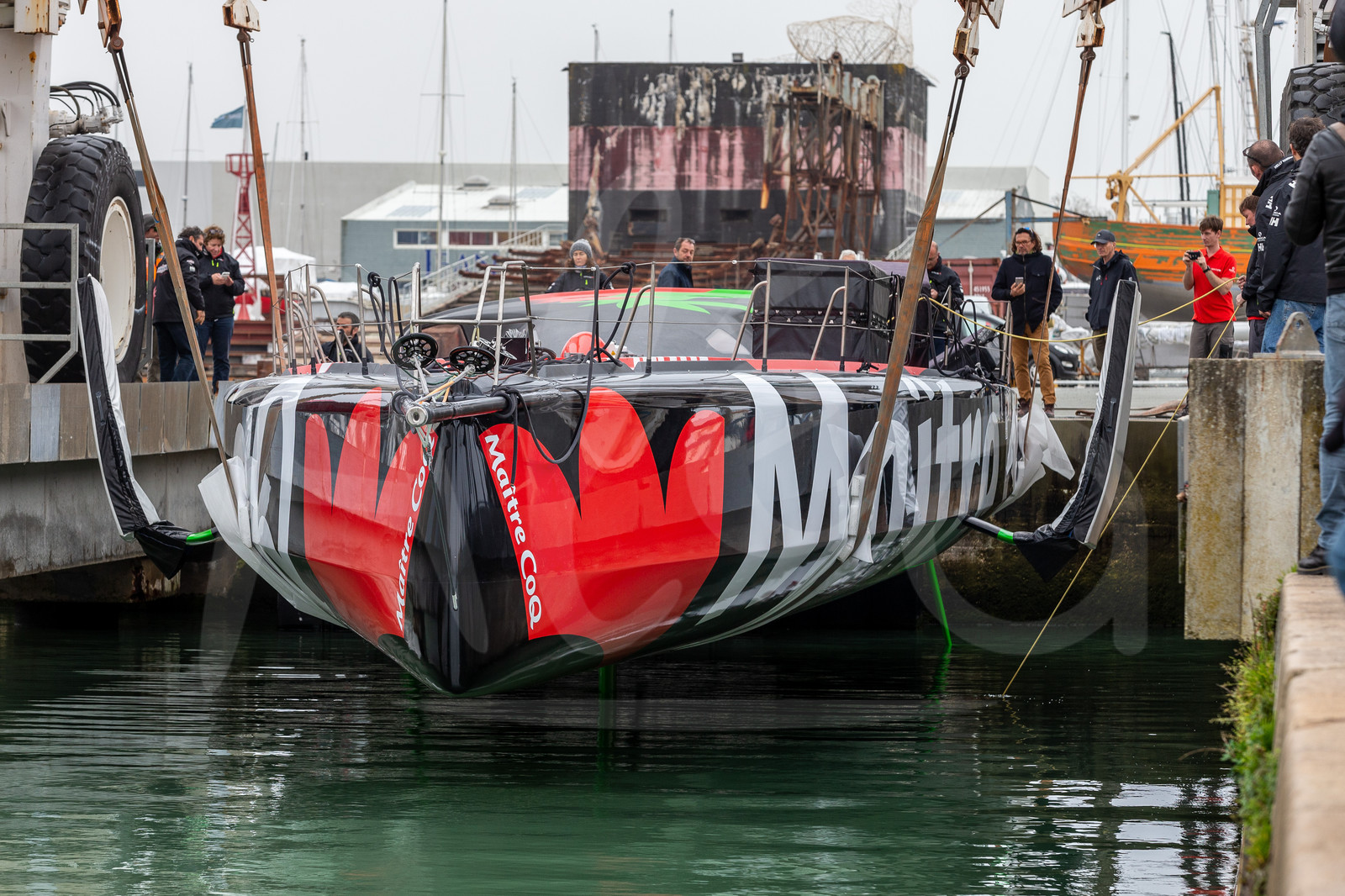 | Description | LA ROCHELLE, FRANCE - MARCH 11: The Imoca boat Maitre Coq is being launched by skipper Yannick Bestaven and his crew on March 11, 2020, in La Rochelle, France. (Photo by Jean-Marie Liot/Alea) |