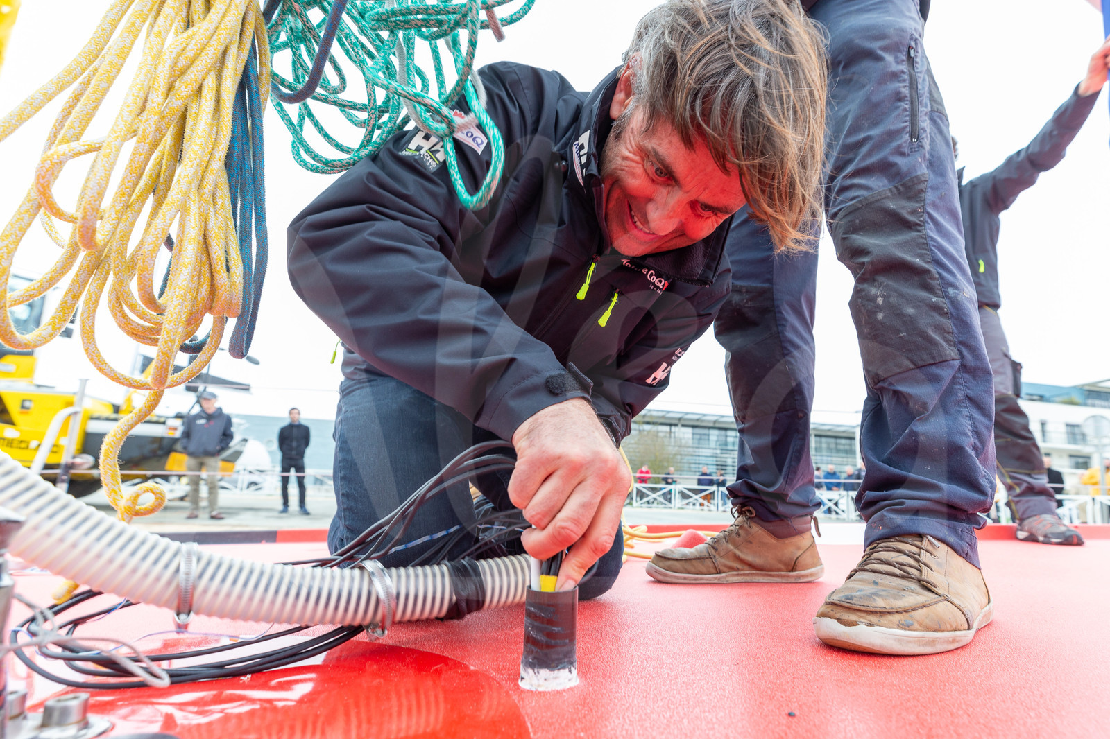 | Description | LA ROCHELLE, FRANCE - MARCH 11: Skipper Yannick Bestaven is helping his crew to prepare his Imoca boat Maitre Coq before her launching, on March 11, 2020, in La Rochelle, France. (Photo by Jean-Marie Liot/Alea) |