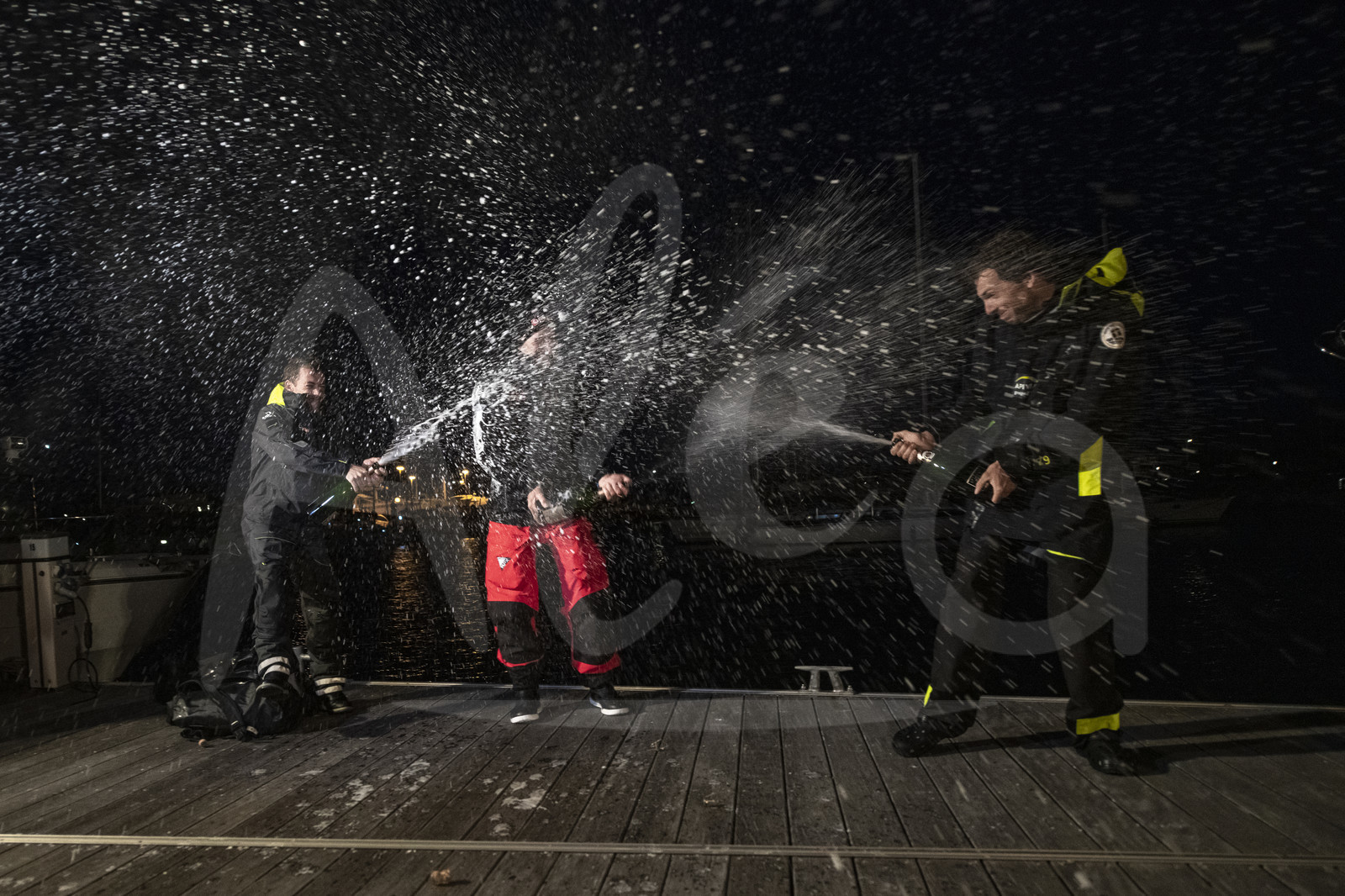 | Description | LES SABLES D'OLONNE, FRANCE - JULY 14: Race podium with Imoca skippers celebrating with champagne, from L to R, Thomas Ruyant, Jeremie Beyou and Charlie Dalin, respectively 3rd, winner and 2nd place of the Vendee Arctique solo sailing race, in Les Sables d'Olonne, France, on July 14, 2020. (Photo by Olivier Blanchet / Alea) |