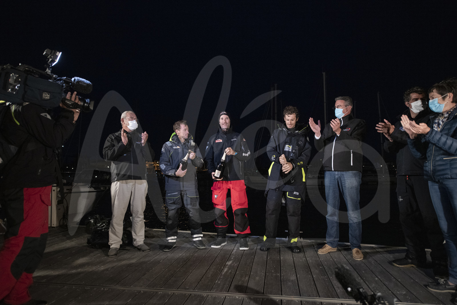 | Description | LES SABLES D'OLONNE, FRANCE - JULY 14: Race podium with officials Yves Auvinet (CG85 President), Yannick Moreau (Les Sables d'Olonne mayor) and Antoine Mermod (Class Imoca President) with Imoca skippers, from L to R, Thomas Ruyant, Jeremie Beyou and Charlie Dalin, respectively 3rd, winner and 2nd place of the Vendee Arctique solo sailing race, in Les Sables d'Olonne, France, on July 14, 2020. (Photo by Olivier Blanchet / Alea) |
