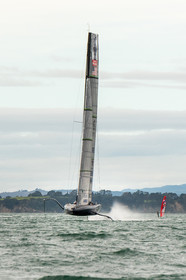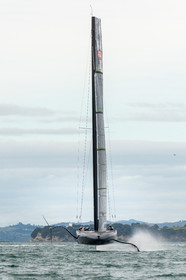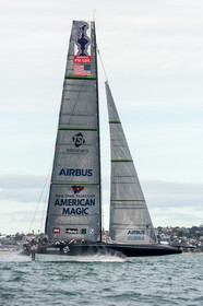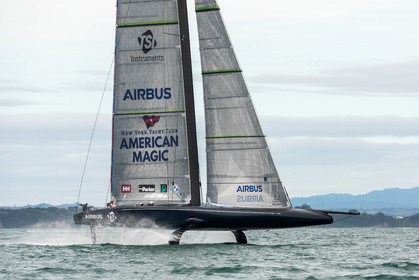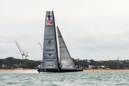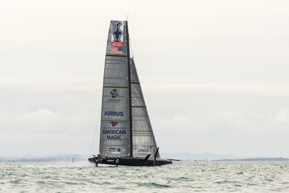Le Team américain surpris en train de sortie son AC75 American Magic pour s'entrainer en baie d'Auckland le 30 Juillet 2020.