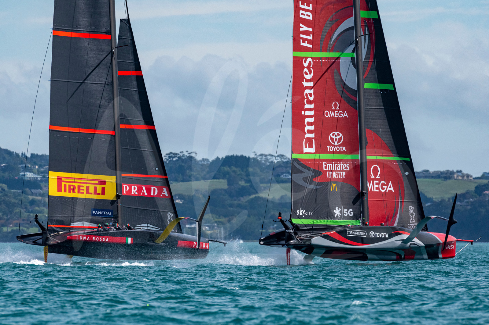 | Description | AUCKLAND, NEW-ZEALAND - DECEMBER 8: Emirates Team New Zealand and Luna Rossa Prada Pirelli Team start a practice race. America's Cup Challengers and the Defender participate in organised practice on the course E race area for the Prada Cup and America's Cup, off Auckland, New-Zealand, on December 8, 2020. (photo by Chris Cameron/Alea) |