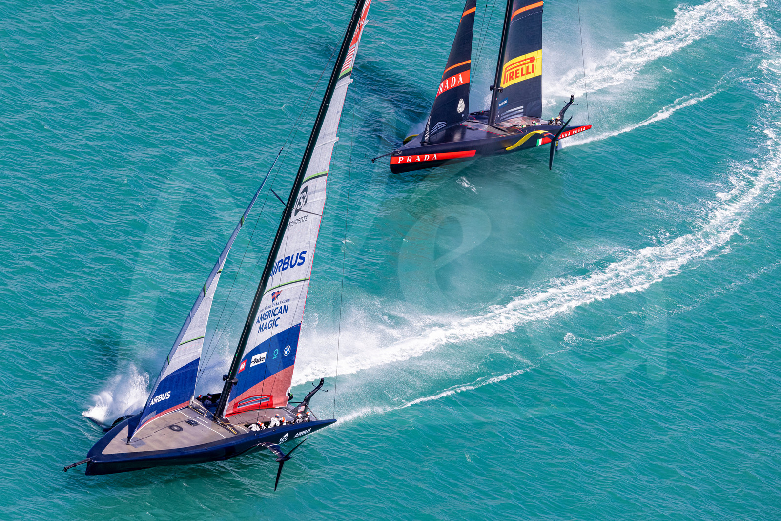 | Description | AUCKLAND, NEW-ZEALAND - JANUARY 11: Luna Rossa Prada Pirelli Team and New York Yacht Club American Magic are pictured during America's Cup presented by Prada training day 1, off Auckland, New-Zealand, on January 11, 2021. (photo by Carlo Borlenghi/Alea) . |