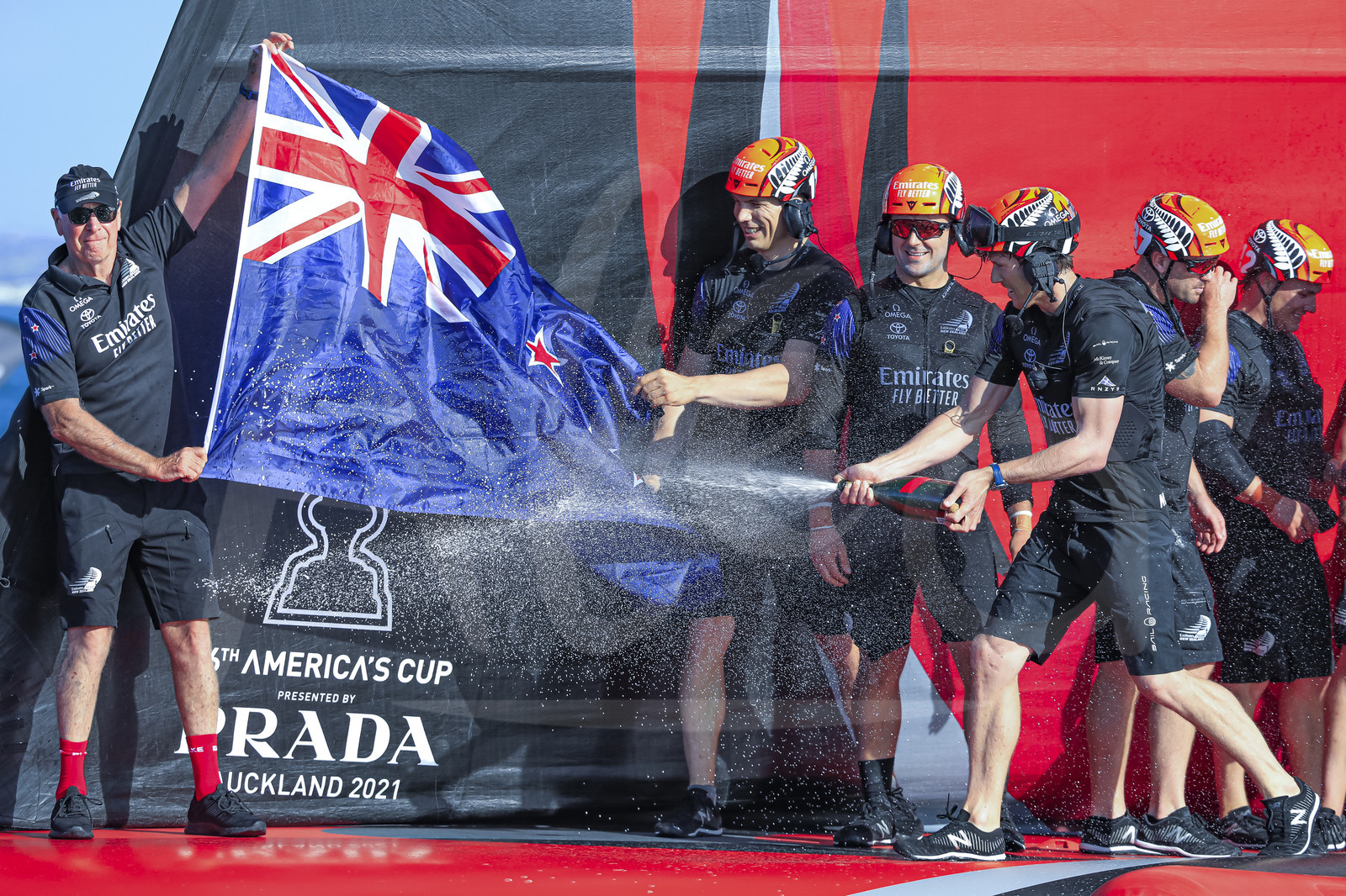 | Description | AUCKLAND, NEW-ZEALAND - MARCH 17: Emirates Team New Zealand crew members celebrate with champagne after winning the America's Cup presented by Prada, in Auckland, New-Zealand, on March 17, 2021. (photo by Stefano Gattini/Alea) |