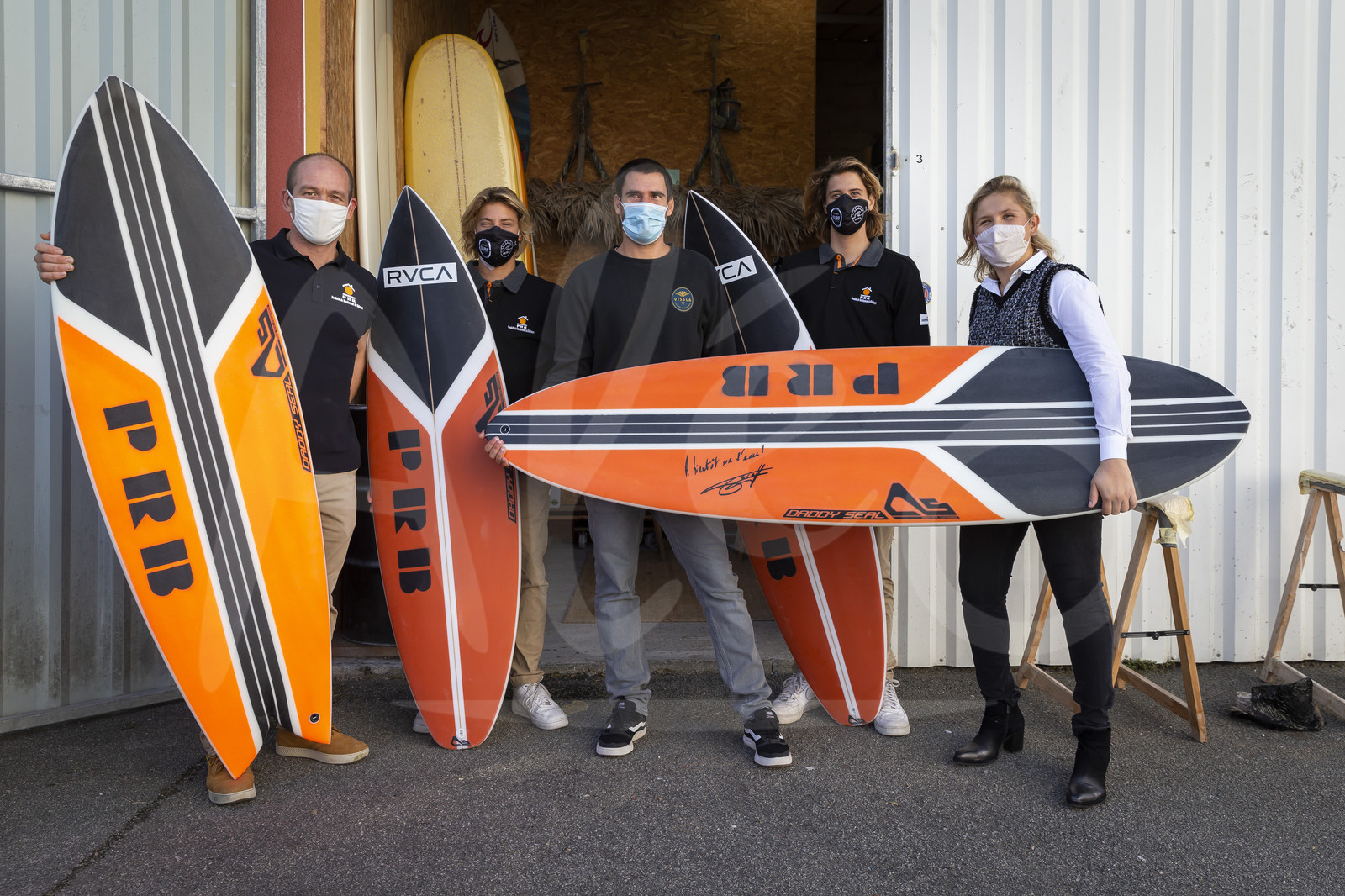 | Description | #EN# LES SABLES D’OLONNE, FRANCE - OCTOBER 22: Skipper Kevin Escoffier receives his surfboard in the colors of his IMOCA PRB, from the hands of the sandy shaper Mathieu Portero (Daddy Seal Surfboards), in the presence of the surfing brothers of Saint-Bathelemy Noé and Thomas Lédée, before the start of the Vendée Globe, in Les Sables d’Olonne, France, on October 22, 2020. (Photo by Jean-Marie Liot/Alea) #FR# LES SABLES D’OLONNE, FRANCE - 22 OCTOBRE: Kevin Escoffier reçoit sa planche de surf aux couleurs de son IMOCA PRB, des mains du shaper sablais Mathieu Portero (Daddy Seal Surfboards), en présence des frères surfeurs de Saint-Bathelemy Noé et Thomas Lédée, avant le départ du Vendée Globe, aux Sables d’Olonne le 22 octobre 2020. (photo Jean-Marie LIOT/AleA) |
