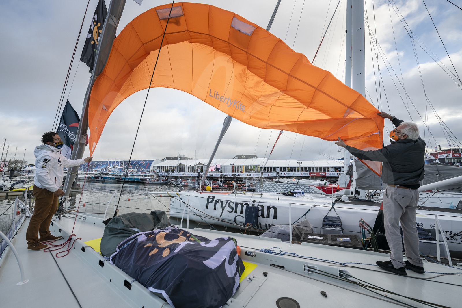 | Description | #EN# LES SABLES D’OLONNE, FRANCE - OCTOBER 21: Sailor Yves Parlier demonstrates and provides a Liberty Kite, sail to help dismasted boats for their return, to skipper Clement Giraud during the Vendee Globe prestart in les Sables d’Olonne, France, on October 21, 2020. (Photo by Olivier Blanchet/Alea) #FR# LES SABLES D’OLONNE, FRANCE - 21 OCTOBRE: Le marin Yves Parlier fait la démonstration et fournit une Liberty Kite, aile servant potentiellement aux bateaux ayant démâté, au skipper Clement Giraud lors de la semaine prestart du Vendee Globe aux Sables d’Olonne, le 21 Octobre 2020. Photo by Olivier Blanchet/Alea) |