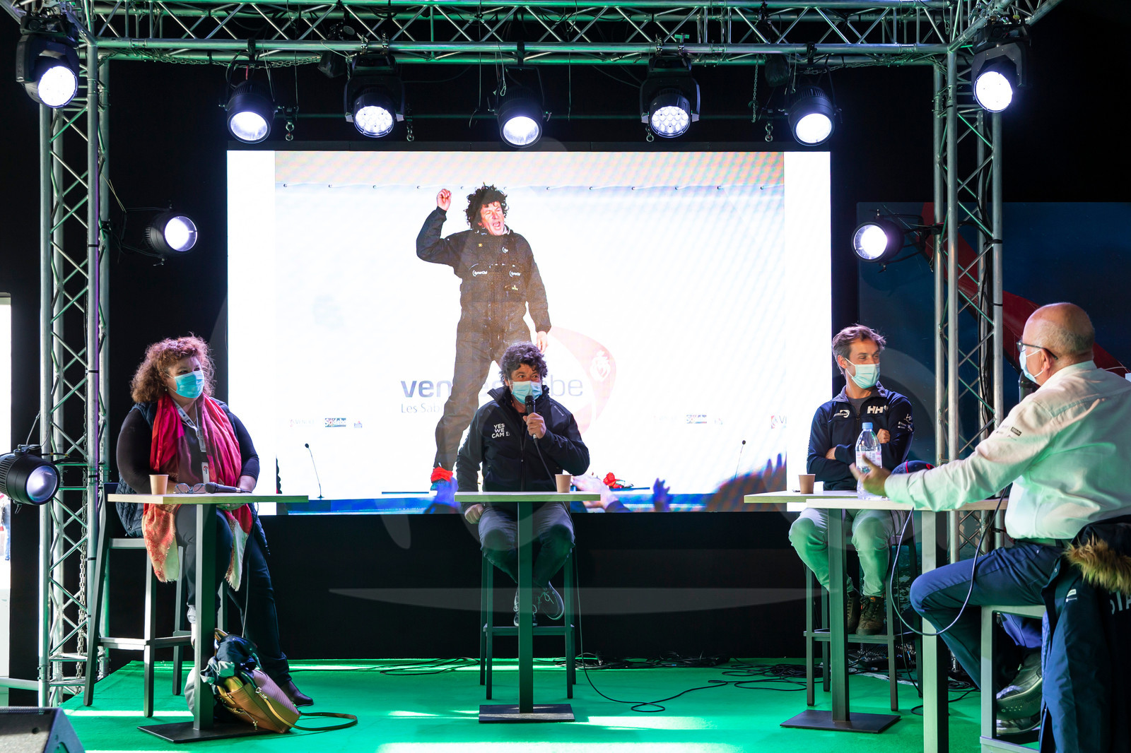 | Description | #EN# LES SABLES D’OLONNE, FRANCE - OCTOBER 26: Skipper Jean Le Cam is a guest of the speaker Vincent Balard, with Hubert Lemonnier (Race direction) and an official from nautic affairs during the Vendee Globe prestart in les Sables d’Olonne, France, on October 26, 2020. (Photo by Jean-Marie Liot/Alea) #FR# LES SABLES D’OLONNE, FRANCE - 26 OCTOBRE: Le skipper Jean Le Cam est l’invité de l’animateur Vincent Balard, avec Hubert Lemonnier (DC- et une responsable des affaires maritimes lors de la semaine prestart du Vendee Globe aux Sables d’Olonne, le 26 Octobre 2020. (Photo by Jean-Marie Liot/Alea) |