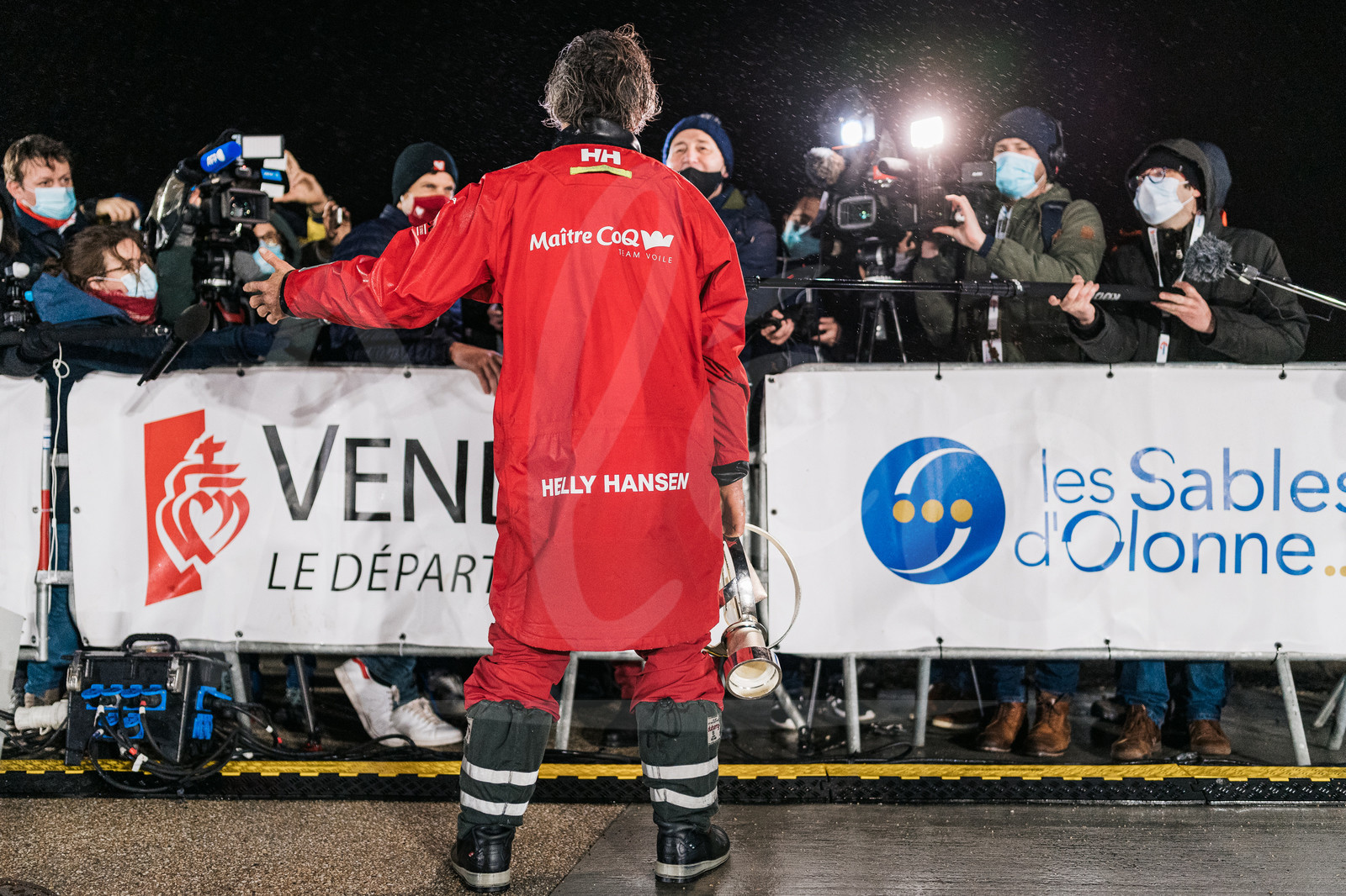 | Description | #EN# LES SABLES D’OLONNE, FRANCE - JANUARY 28: Skipper Yannick Bestaven (FRA), Maitre Coq, is pictured with medias and trophy during finish of the Vendee Globe sailing race, on January 28, 2021. (Photo by Jean-Louis Carli/Alea) #FR# LES SABLES D’OLONNE, FRANCE - 28 JANVIER: Le skipper Yannick Bestaven (FRA), Maitre Coq, est photographié avec les médias et son trophée lors de son arrivée dans la course du Vendee Globe, le 28 Janvier 2021. (Photo Jean-Louis Carli/Alea) |