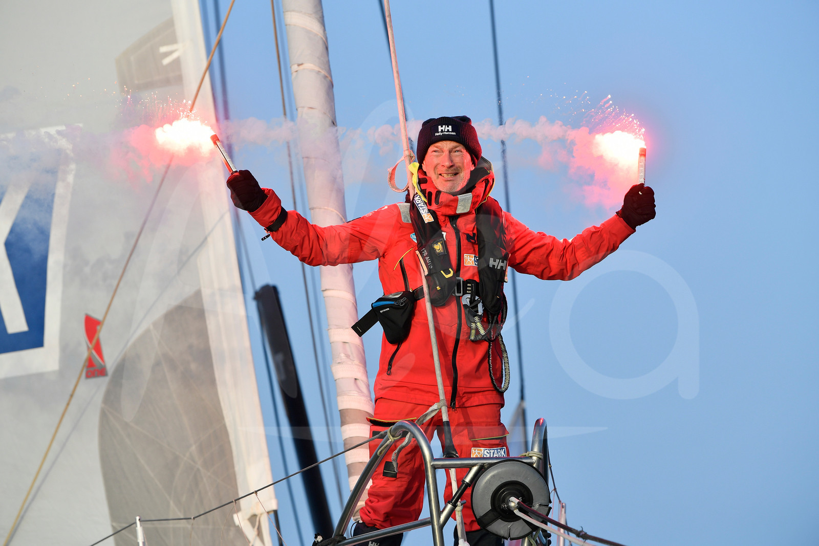 Description#EN# LES SABLES D’OLONNE, FRANCE - MARCH 05 : Skipper Ari Huusela (FIN), STARK, is pictured celebrating with flares in the channel during arrival of the Vendee Globe sailing race, on March 05, 2021. (Photo by Jean-Louis Carli/Alea)