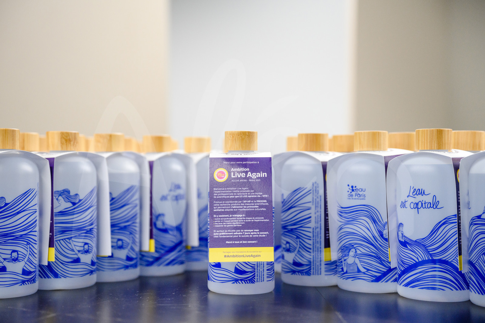 PARIS, FRANCE - 29 MAI: Illustrations des gourdes d’eau qui seront distribuées au public pendant l’étude médicale et concert test Ambition Live Again qui se déroule à l’AccorHotels Arena de Paris, le 29 Mai 2021. (Photo Jean-Louis Carli/Alea)