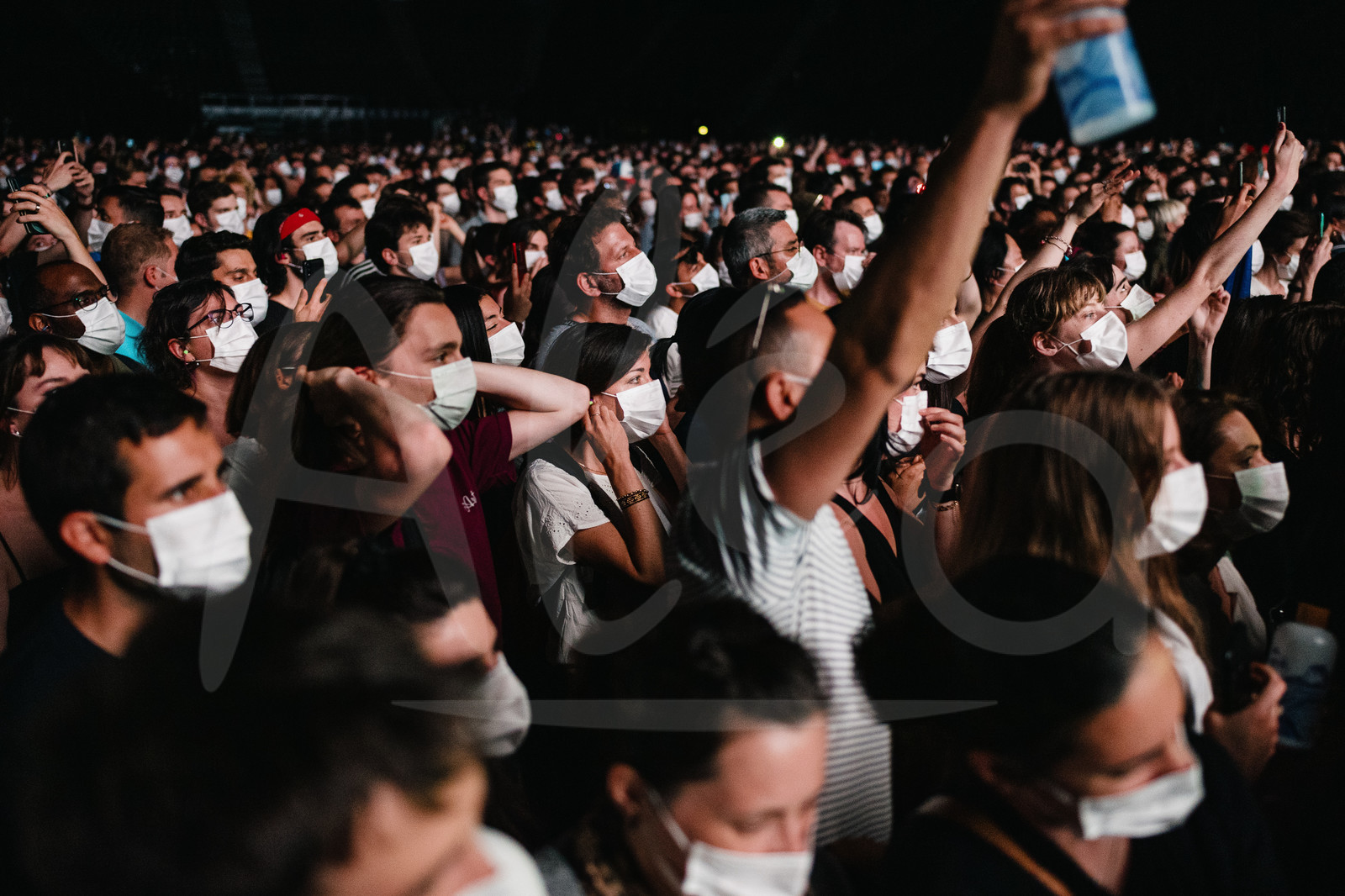 DescriptionPARIS, FRANCE - 29 MAI: Le public masqué et testé assiste à un concert du groupe Indochine lors de l’étude médicale et concert test Ambition Live Again qui se déroule à l’AccorHotels Arena de Paris, le 29 Mai 2021. (Photo Jean-Louis Carli/Alea)