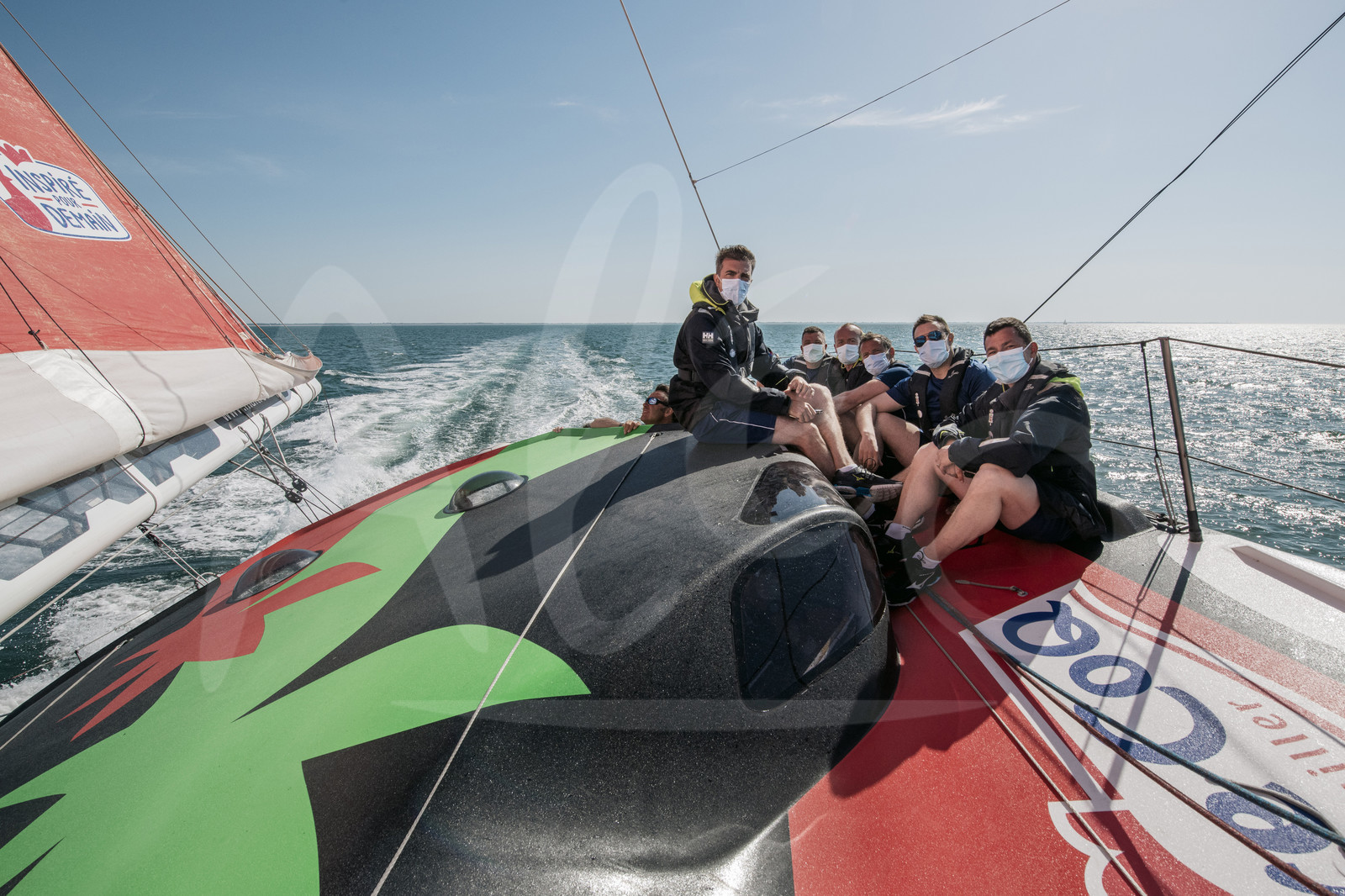 | Description | LA ROCHELLE, FRANCE - JUNE 14: Members of the PAF, Patrouille Aerienne de France, are sailing on Imoca Maitre Coq with winner of the Vendee Globe Yannick Bestaven, on June 14, 2021 in La Rochelle, France. (Photo by Olivier Blanchet / Alea) |