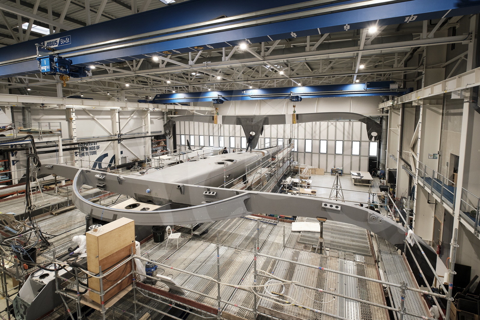 | Description | Construction du trimaran Ultim M101 (François Gabart) dans les locaux de Mer Concept à Concarneau le 08/02/2021 - mise en place du bras avant - Photo Benoit Stichelbaut / Alea |