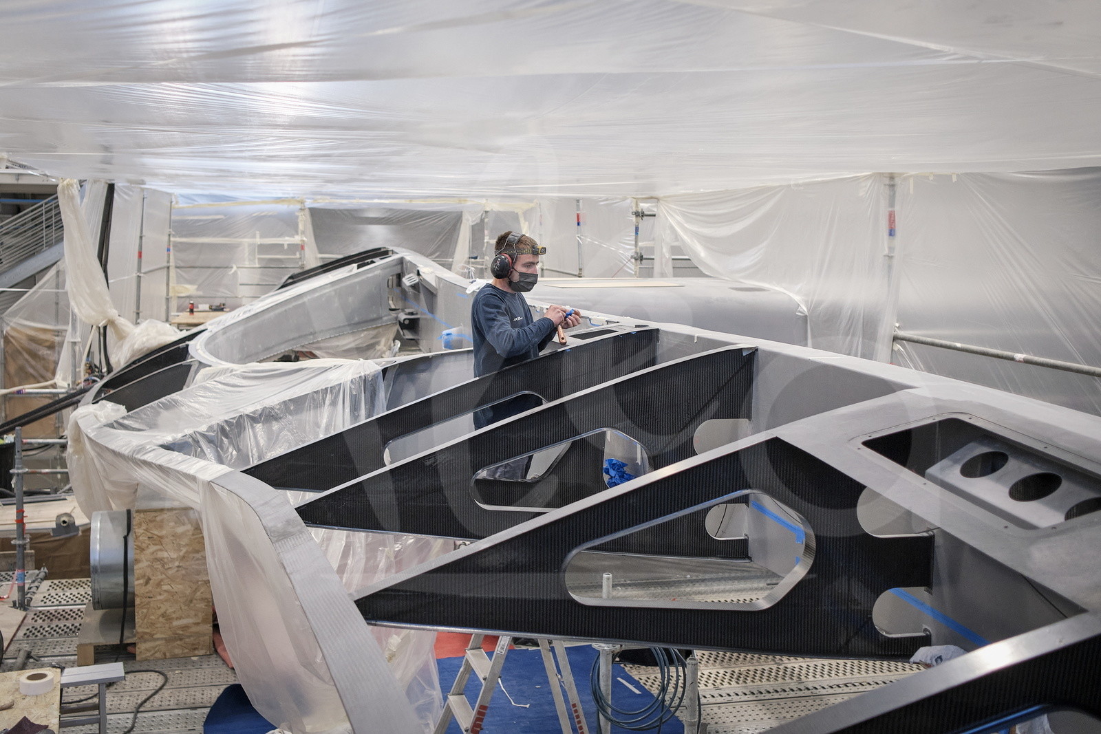 | Description | Mer Concept - construction du trimaran M101 à Concarneau - 17/05/2021 - Hugo MARTIN (Technicien Composites) travail sur le bras arrière au niveau du « fairing » (plan aérodynamique du bras arrière) - Photo Benoit Stichelbaut / Alea |
