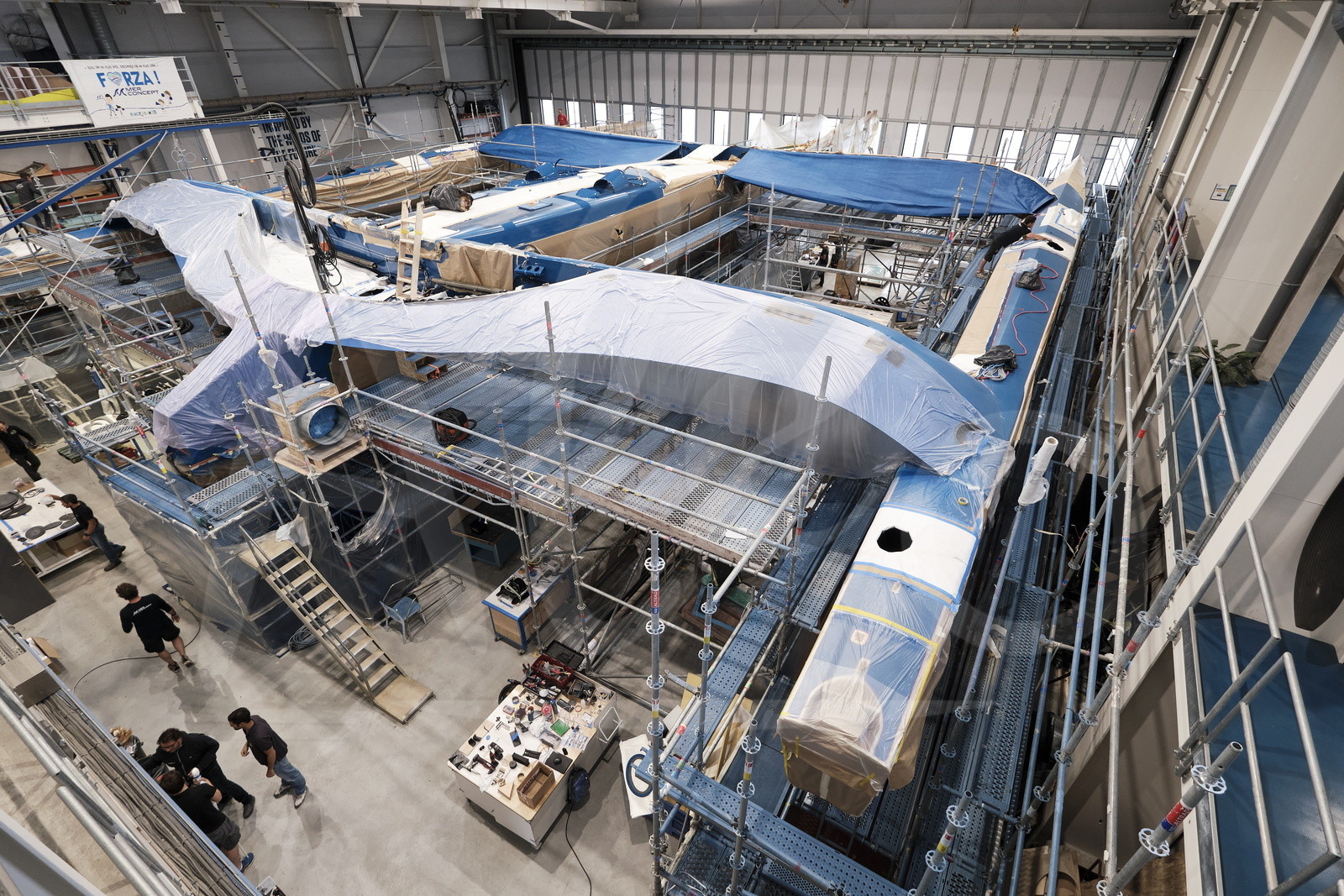 | Description | Mer Concept - construction du trimaran M101 à Concarneau - 05/07/2021 - peinture du trimaran en cours aux couleurs du sponsor - Photo Benoit Stichelbaut / Alea |