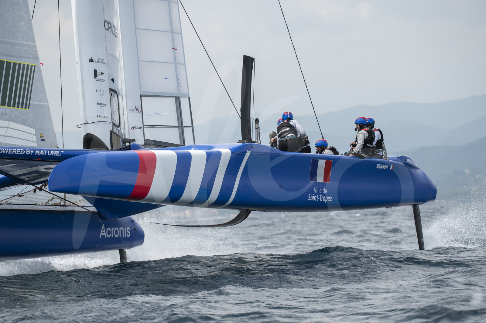 | Description | ST TROPEZ, FRANCE - SEPTEMBER 10: Billy Besson’s France SailGP Team, with Francois Morvan (flight controller), Leigh MacMillan (grinder), Matthieu Vandamme, Olivier Herledant, Thimote Lapauw, Amélie Riou and Helene Noesmoen, is competing during practice day of SailGP on Saint-Tropez Harbour on September 10, 2021 in St Tropez, France. (Photo by Olivier Blanchet /Alea) |