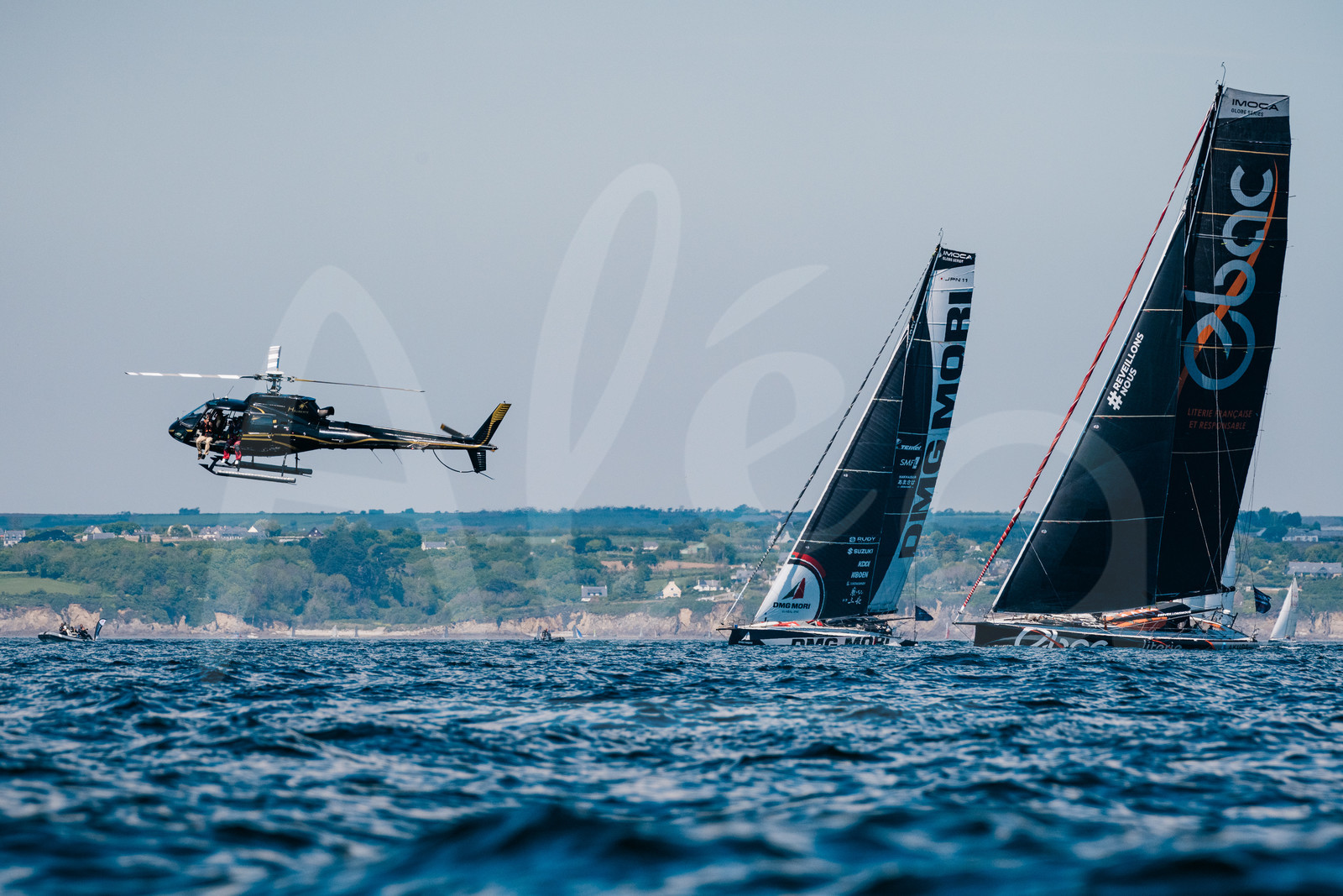 | Description | BREST, FRANCE - MAY 8 : The boats DMG MORI, skipper Kojiro Shiraishi, and EBAC, skipper Antoine Cornic, are illustrated during start of the Imoca Guyader Bermudes 1000 sailing race, in Brest, on May 8th, 2022. (photo by Jean-Louis Carli / Alea) |