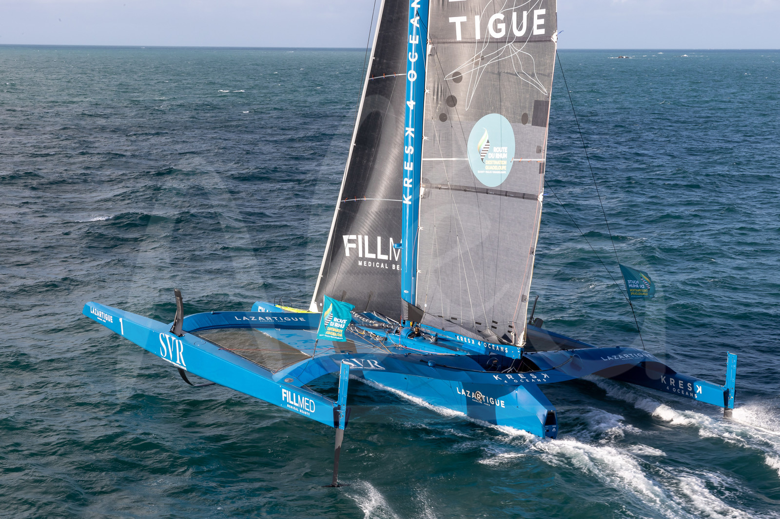DescriptionSAINT-MALO, FRANCE - NOVEMBRE 9 : Ultim SVR Lazartigue, skipper Francois Gabart, is competing during start of La Route du Rhum - Destination Guadeloupe 2022 on November 9, 2022, in Saint-Malo, France. (photo Jean-Marie LIOT / AleA)