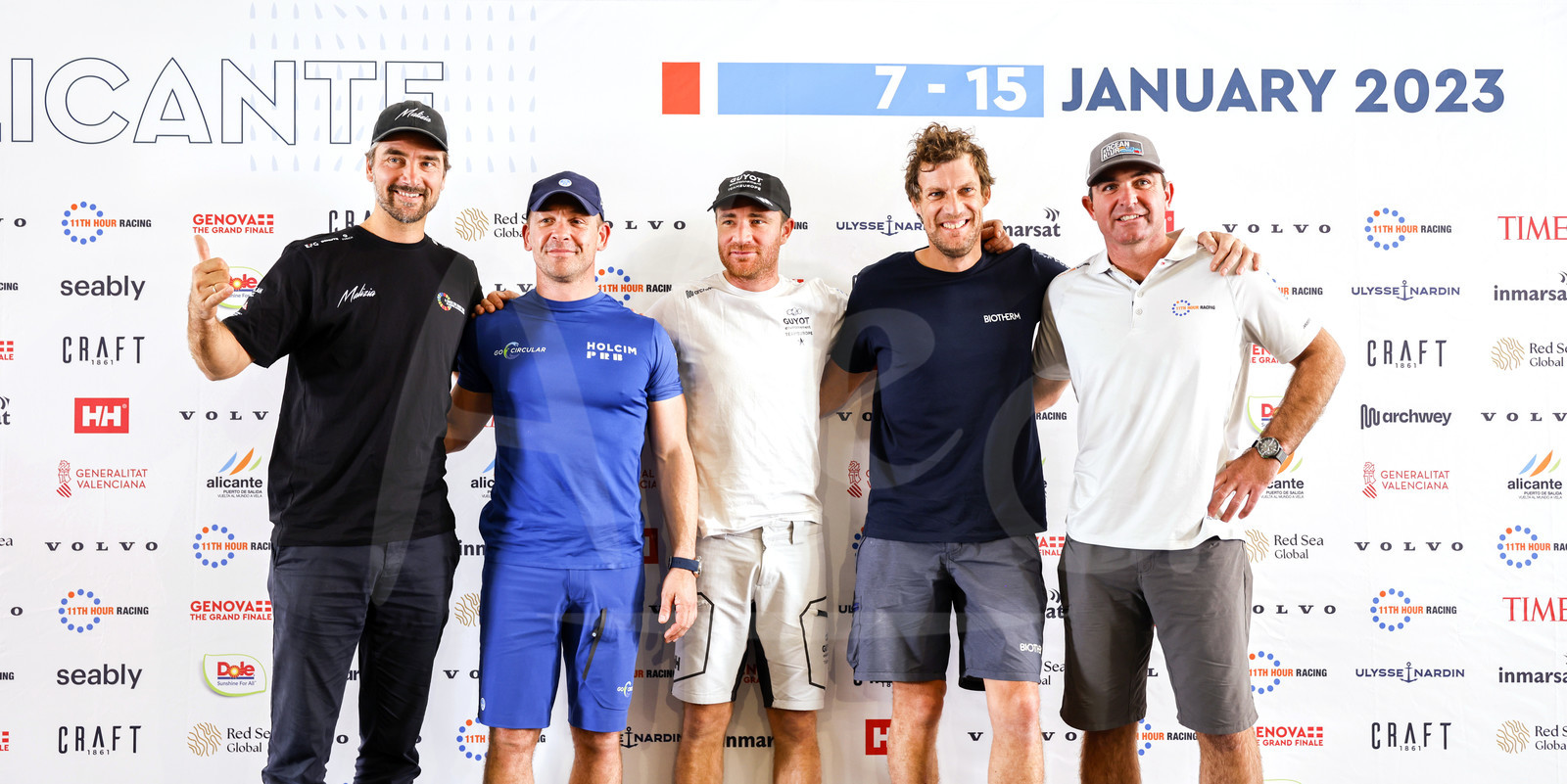 | Description | ALICANTE, SPAIN - JANUARY 13 : Imoca competition skippers are portraited, from left to right: Boris Herrmann, Kevin Escoffier, Benjamin Dutreux, Paul Meilhat and Charlie Enright, before start of The Ocean Race, sailing crew competition in Imoca or VO65, in Alicante, Spain, on January 13, 2023 - (photo Carlo Borlenghi / AleA) |