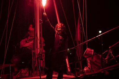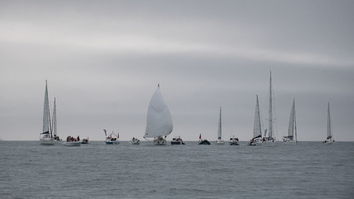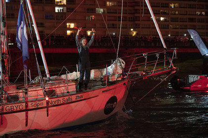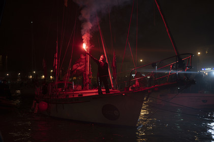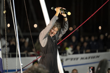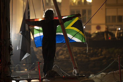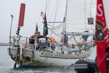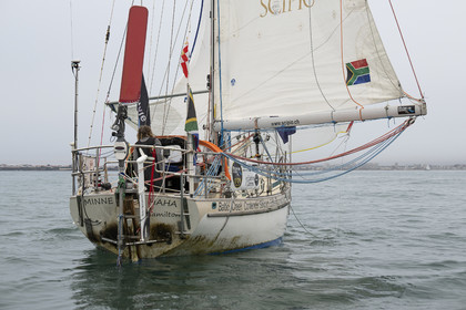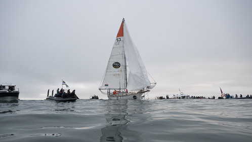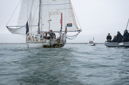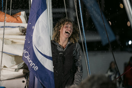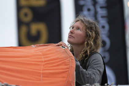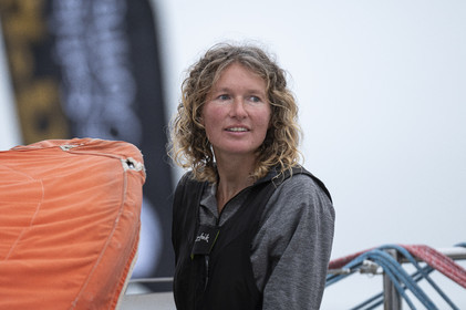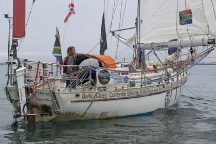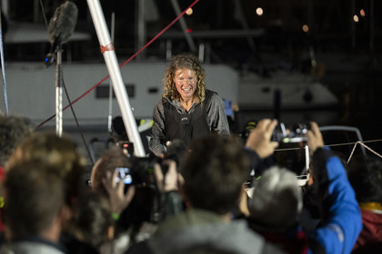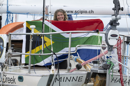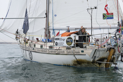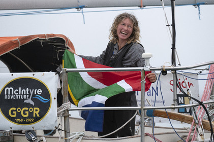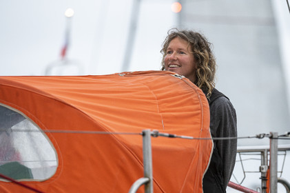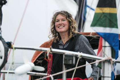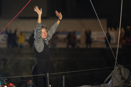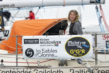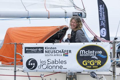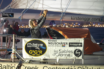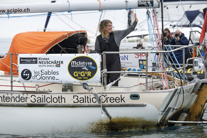 Arrivée de Kirsten Neushäfer, skipper sud-africaine vainqueur de la Golden Globe Race, course autour du monde en solitaire, sans assistance et sans électronique, le 27 avril 2023 aux Sables d'Olonne. Photos : Olivier Blanchet pour Alea