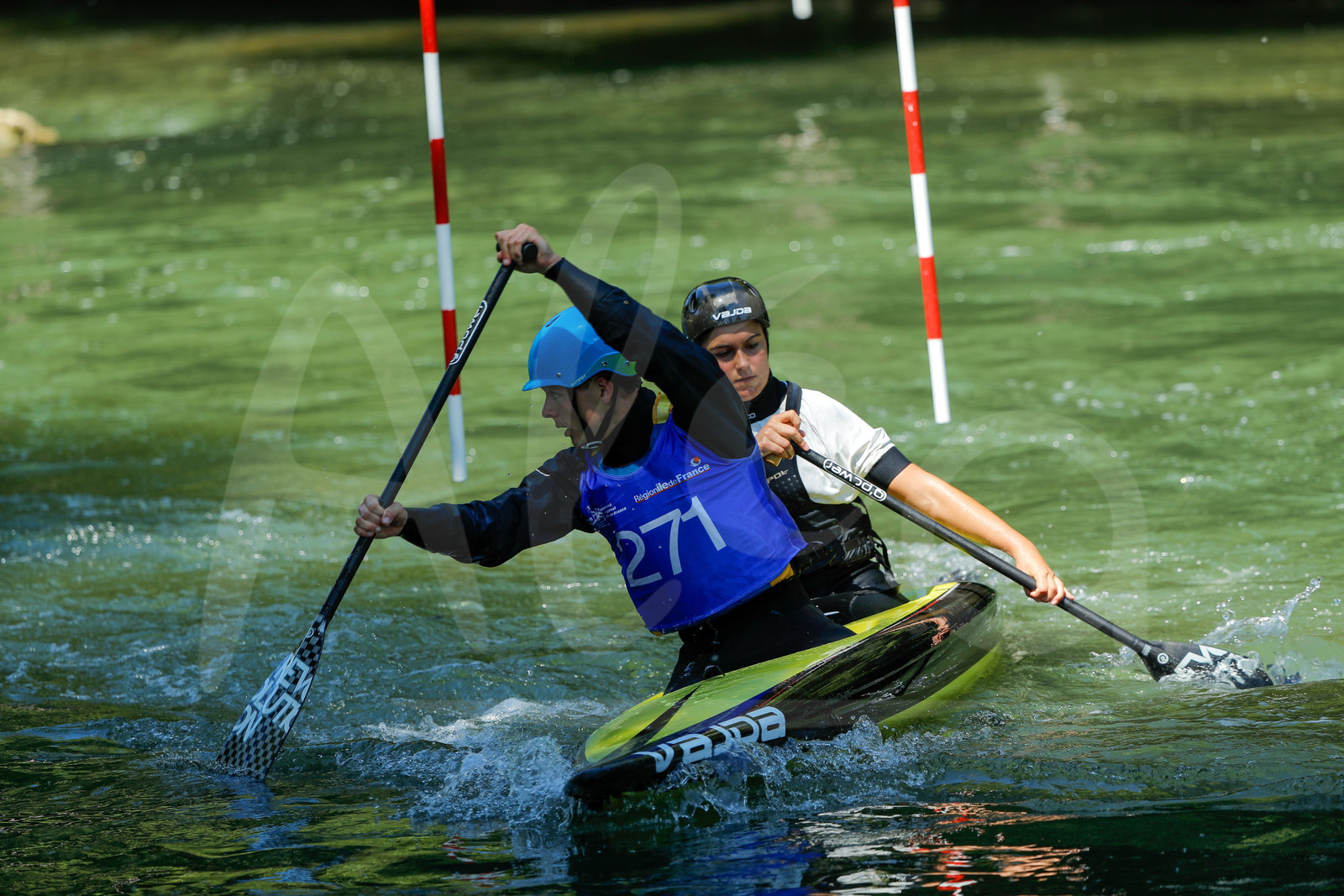 | Description | CHAMPS SUR MARNE, FRANCE - Juin 25, 2023 : Romane Breuzard et Matis Hernu de l’Union Sportive Charitoise, est photographié en action lors du championnat régional de canoë-kayak de Champs Sur Marne, le 25 juin 2023. (photo by Stéphane Allaman / Alea) |