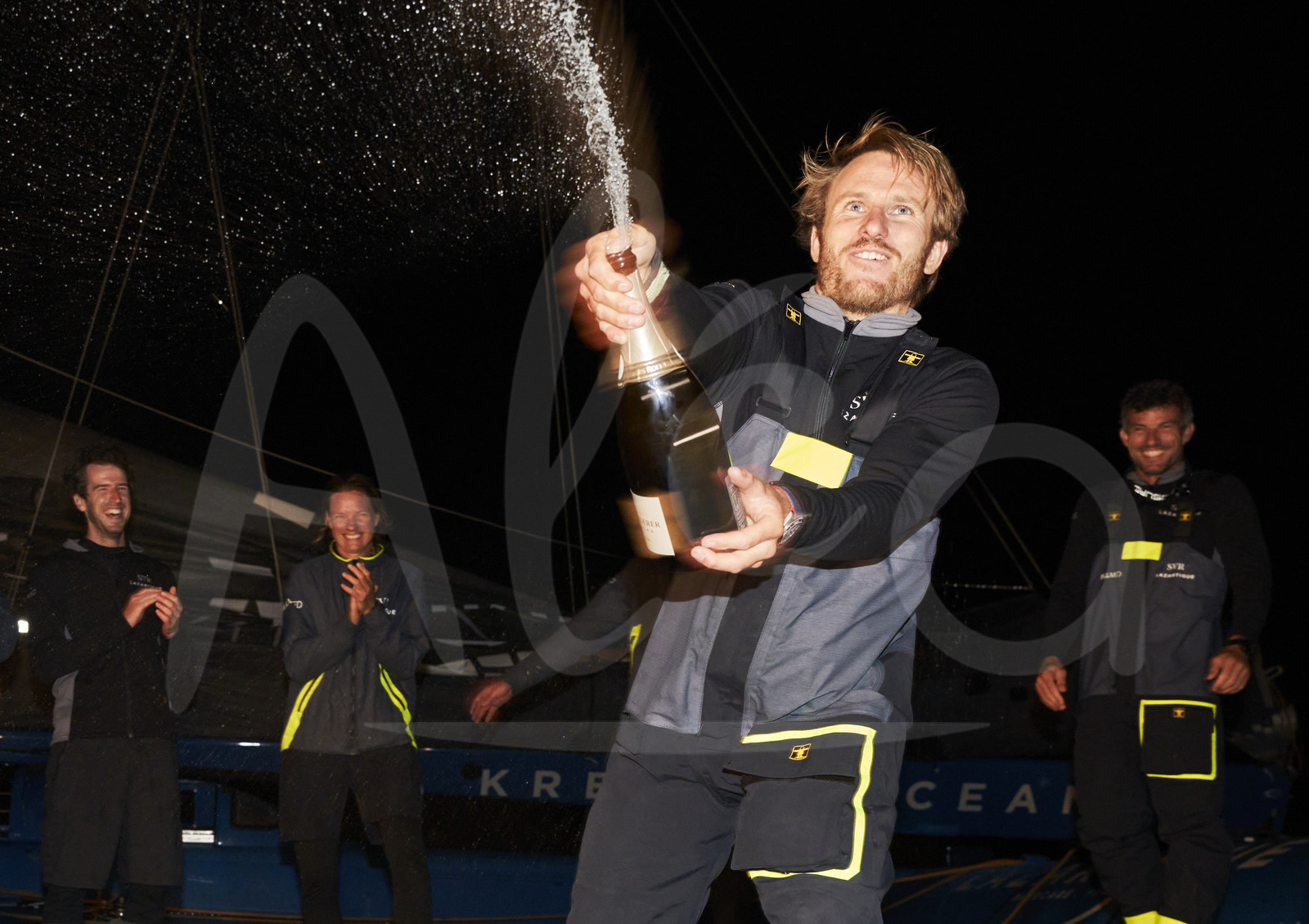| Description | SVR LAZARTIGUE, Skipper: François Gabart, Class: Ultim 32/23 , Sail No: 1, LOA: 32, Design: Ultim, County/State: FRANCE is pictured celebrating with his crew after winning the Ultim category during the Fastnet Race 2023 from Cowes to Cherbourg, on July 23, 2023. Photo by Carlo Borlenghi / Alea |