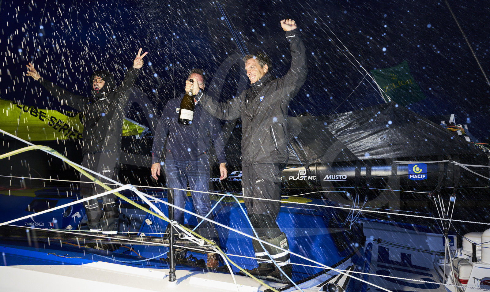 | Description | IMOCA MACIF, Skipper: Charlie Dalin, Class: IMOCA 60, Sail No: FRA79, LOA: 18, Design: IMOCA 60, County/State: FRANCE is pictured celebrating with champagne after winning the IMOCA category with Pascal Bidegrorry during the Fastnet Race 2023 from Cowes to Cherbourg, on July 24, 2023. Photo by Carlo Borlenghi / Alea |