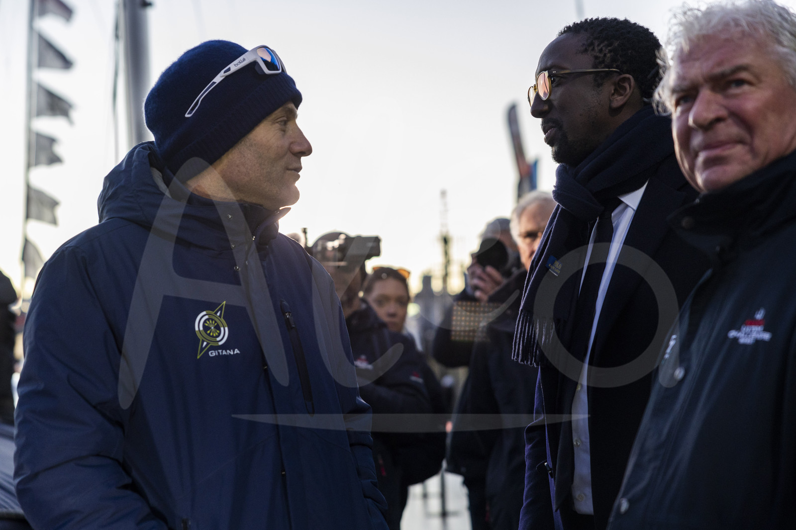 | Description | BREST, FRANCE - JANUARY 07 : Maxi Edmond de Rothschild skipper Charles Caudrelier is portraited with Ministre de la Mer Hervé Berville and Brest mayor François Cuillandre during start of the Arkea Ultim Challenge sailing race in Brest, France, on January 07, 2024. (photo by Jean-Marie Liot / Alea) |