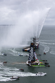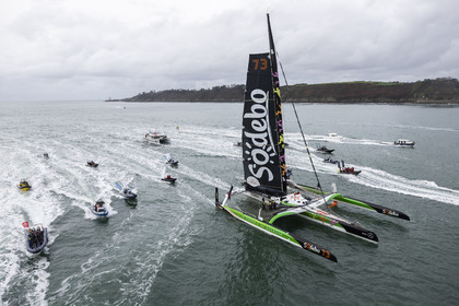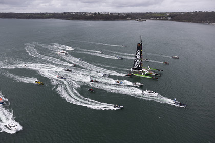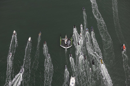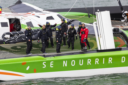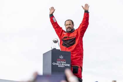 Photos de l'arrivée du vainqueur Charles Caudrelier sur le Maxi Trimaran Edmond de Rothschild - Gitana 17, à Brest, après une navigation de 50j 19h 7' 42"