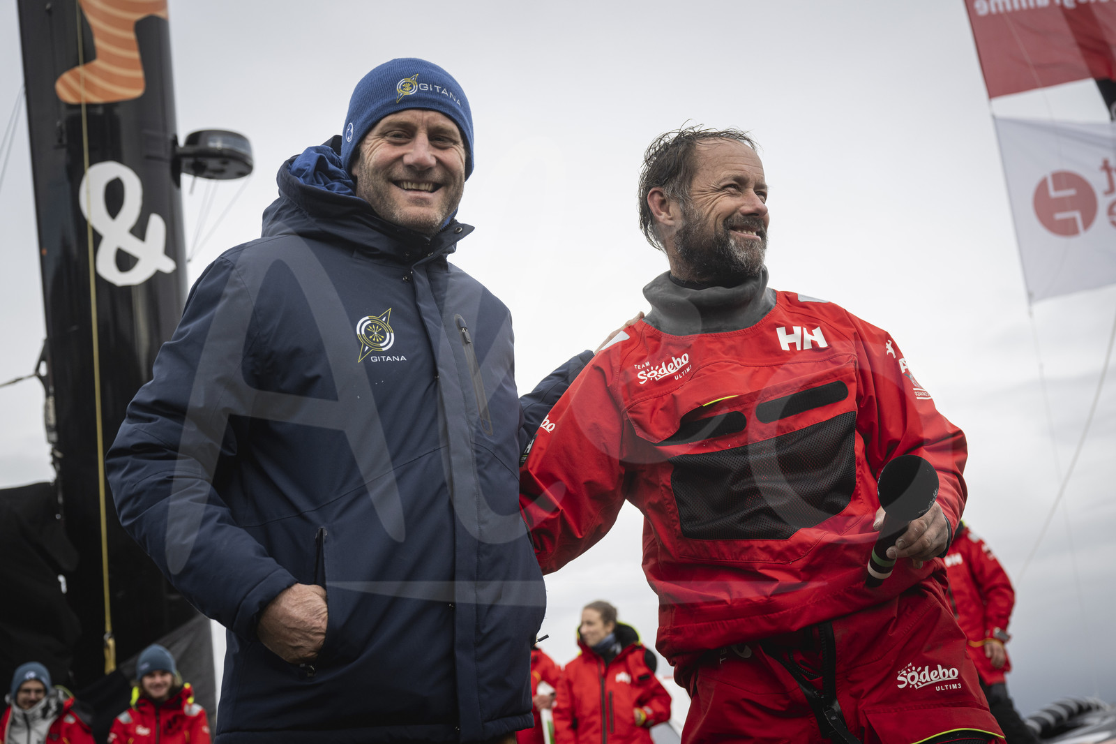 | Description | BREST, FRANCE - JANUARY 29: French skipper Thomas Coville on Sodebo Ultim 3 is pictured with winner Charles Caudrelier after taking second place of the Arkea Ultim Challenge Brest, on January 29, 2024 in Brest, France. (Photo by Vincent Curutchet/ALeA) |