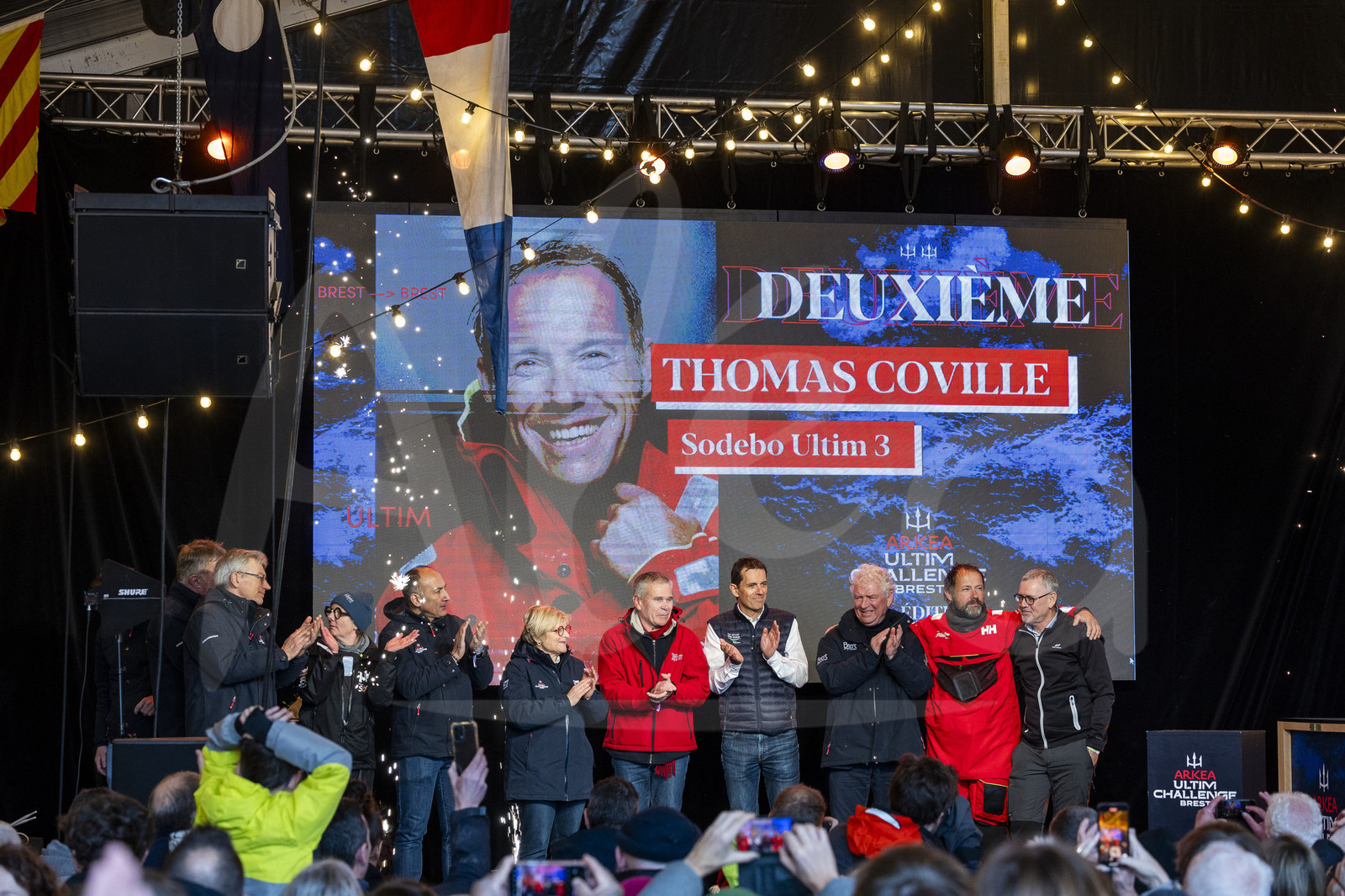 | Description | Thomas Coville, skipper de Sodebo Ultim, 2e de l’Arkea Ultim Challenge, Course autour du Monde en Solitaire, en 53 jours 1 heure 12 minutes et 40 secondes, à Brest le 29/02/2024, photo © Jean-Marie LIOT / Alea #### Thomas Coville, skipper of Sodebo Ultim, finishing second of the Arkea Ultim Challenge, Non stop Ultim solo handed race around the World, in second position in 53 days, 1 hour, 12 minutes et 40 secondes, off Brest on 2024, February 29, photo © Jean-Marie LIOT / Alea |