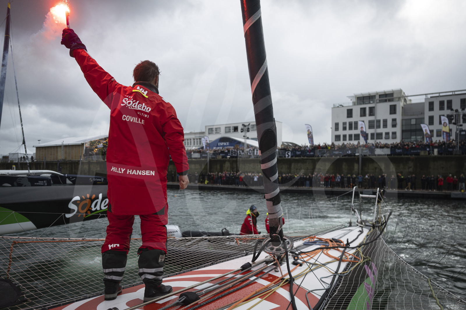 | Description | BREST, FRANCE - JANUARY 29: French skipper Thomas Coville on Sodebo Ultim 3 is pictured celebrating with flares after taking second place of the Arkea Ultim Challenge Brest, on January 29, 2024 in Brest, France. (Photo by Vincent Curutchet/ALeA) |