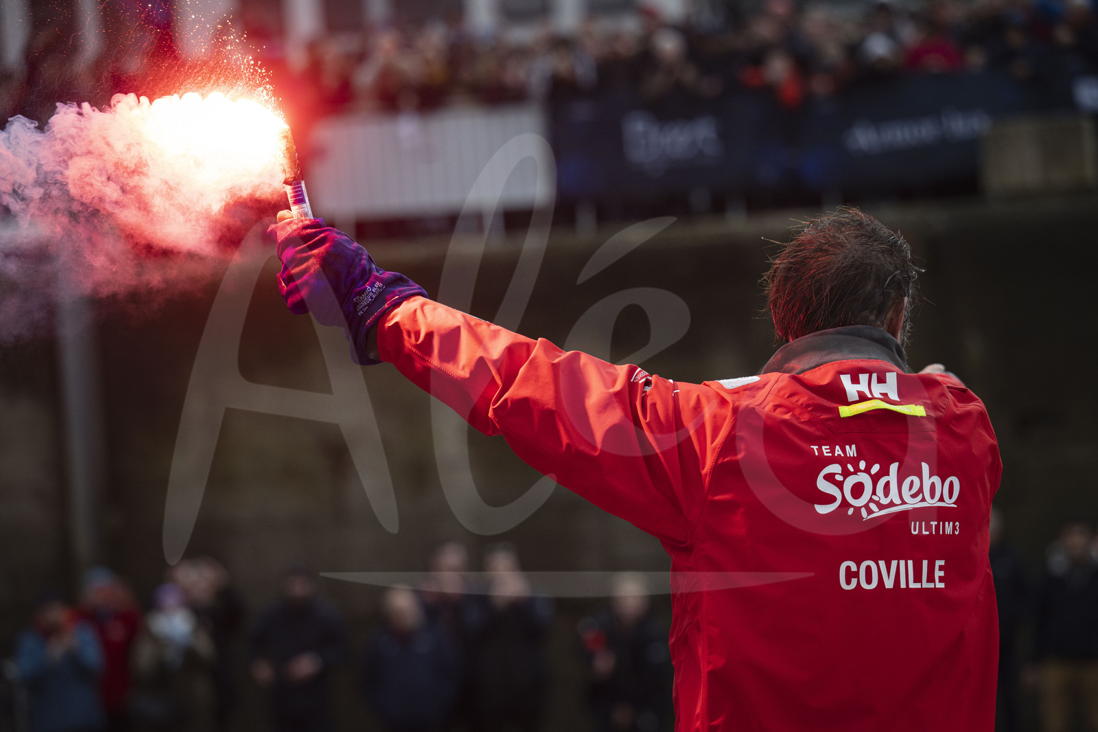 | Description | BREST, FRANCE - JANUARY 29: French skipper Thomas Coville on Sodebo Ultim 3 is pictured celebrating with flares after taking second place of the Arkea Ultim Challenge Brest, on January 29, 2024 in Brest, France. (Photo by Vincent Curutchet/ALeA) |