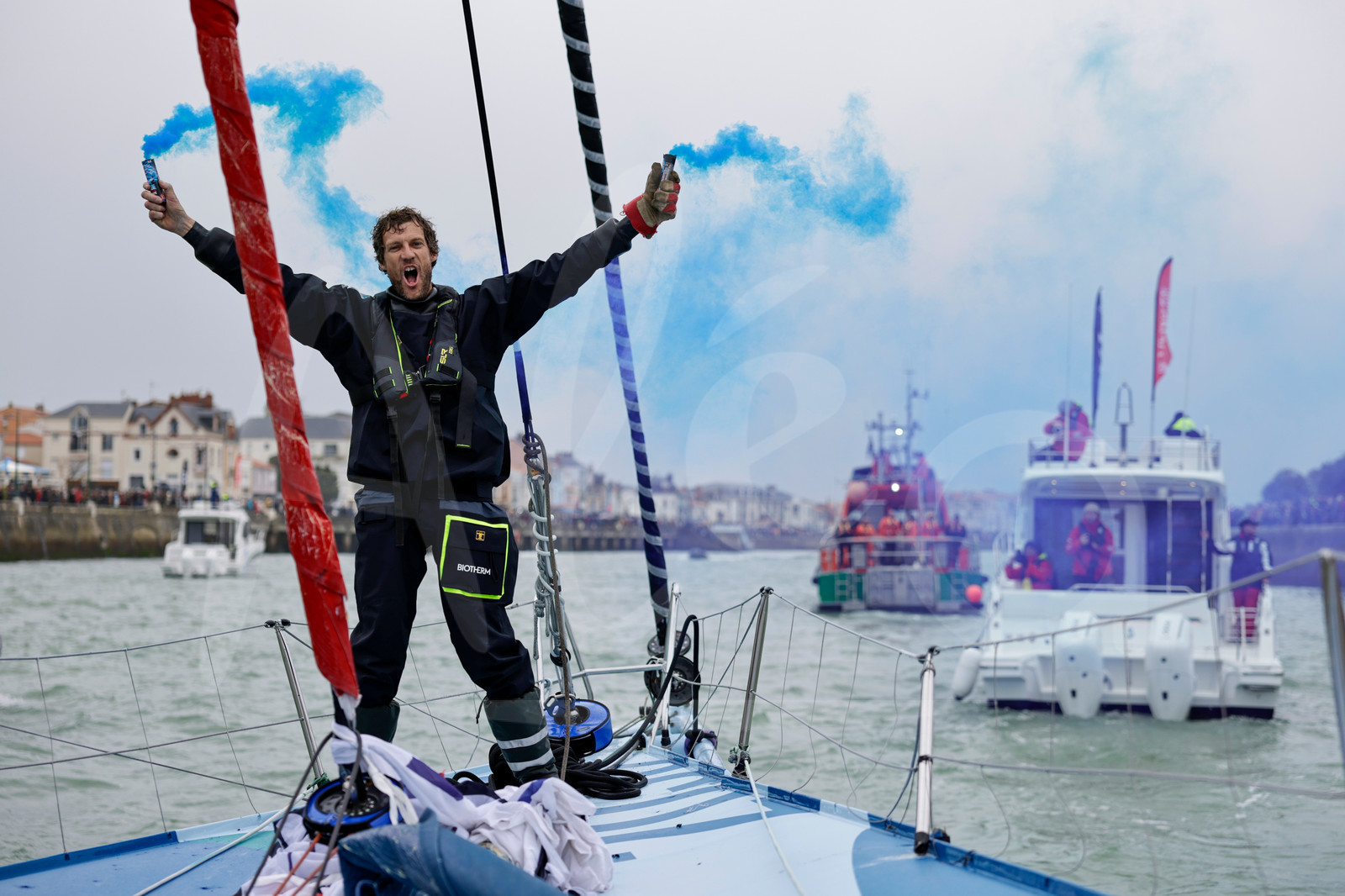 | Description | LES SABLES D'OLONNE, FRANCE - JANUARY 24, 2025 : Biotherm skipper Paul Meilhat (FRA) is photographed celebrating with blue flares in the channel after taking 5th place in the Vendee Globe, on January 24, 2025 in Les Sables d'Olonne, France - (Photo by Anne Beauge / Alea) |