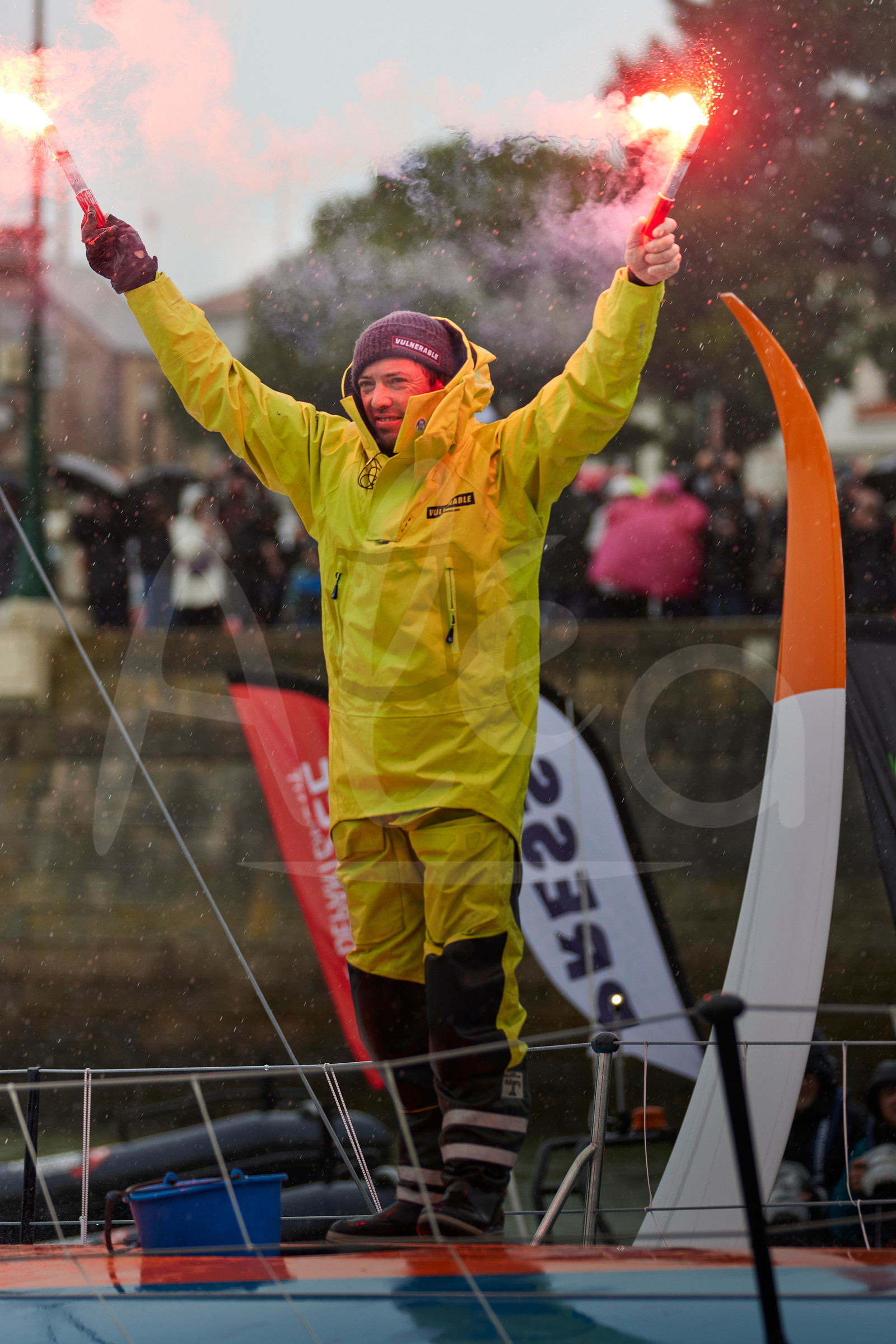 | Description | LES SABLES D'OLONNE, FRANCE - JANUARY 25, 2025 : VULNERABLE skipper Thomas Ruyant (FRA) is celebrating after taking 7th place in the Vendee Globe, on January 25, 2025 in Les Sables d'Olonne, France - (Photo by Anne Beauge / Alea) |