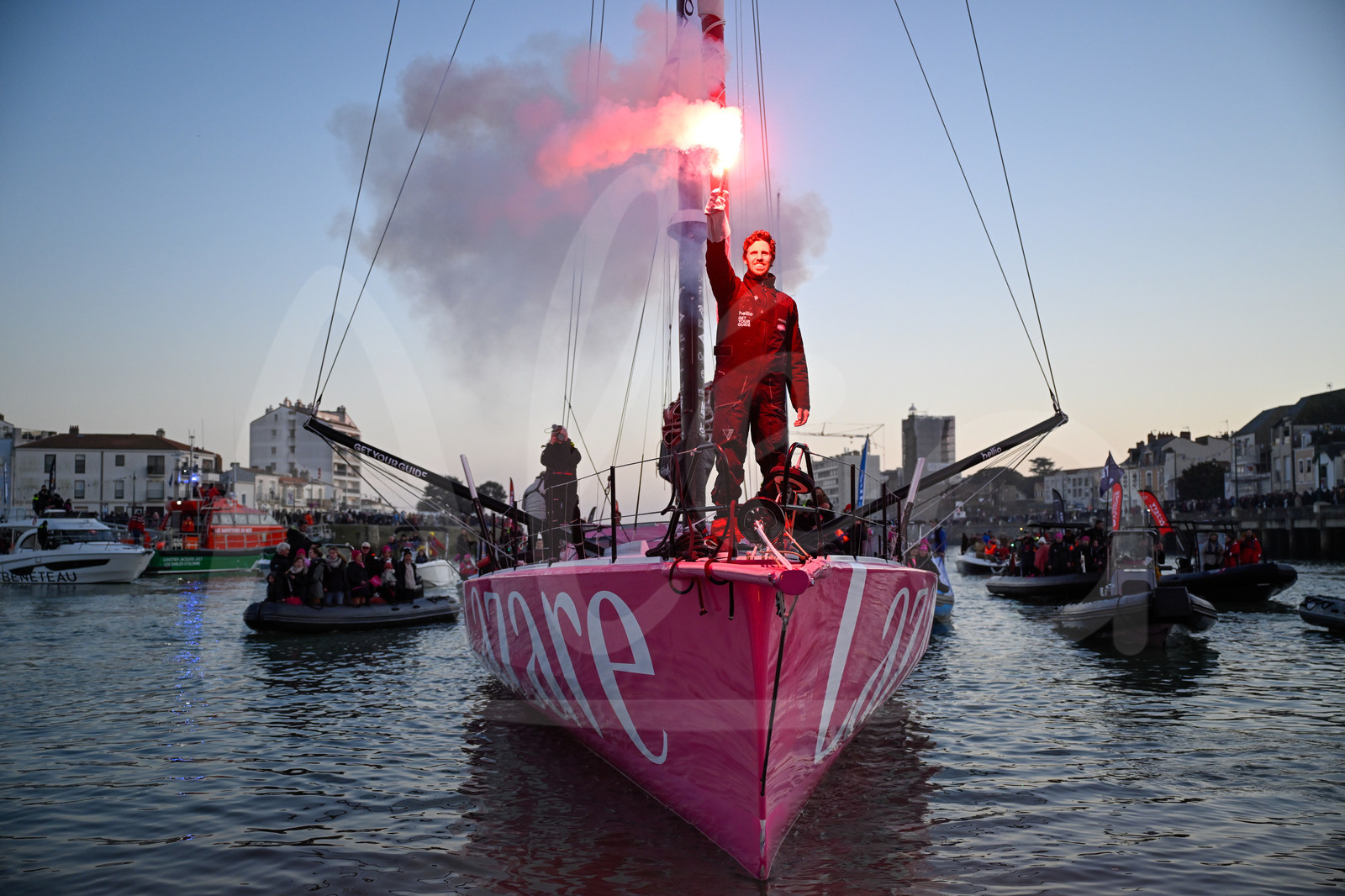 | Description | LES SABLES D’OLONNE, FRANCE - FEBRUARY 03, 2025 : Lazare skipper Tanguy Le Turquais (FRA) is celebrating after taking 17th place in the Vendee Globe, on February 03, 2025 in Les Sables d'Olonne, France - (Photo by Jean-Louis Carli / Alea) |
