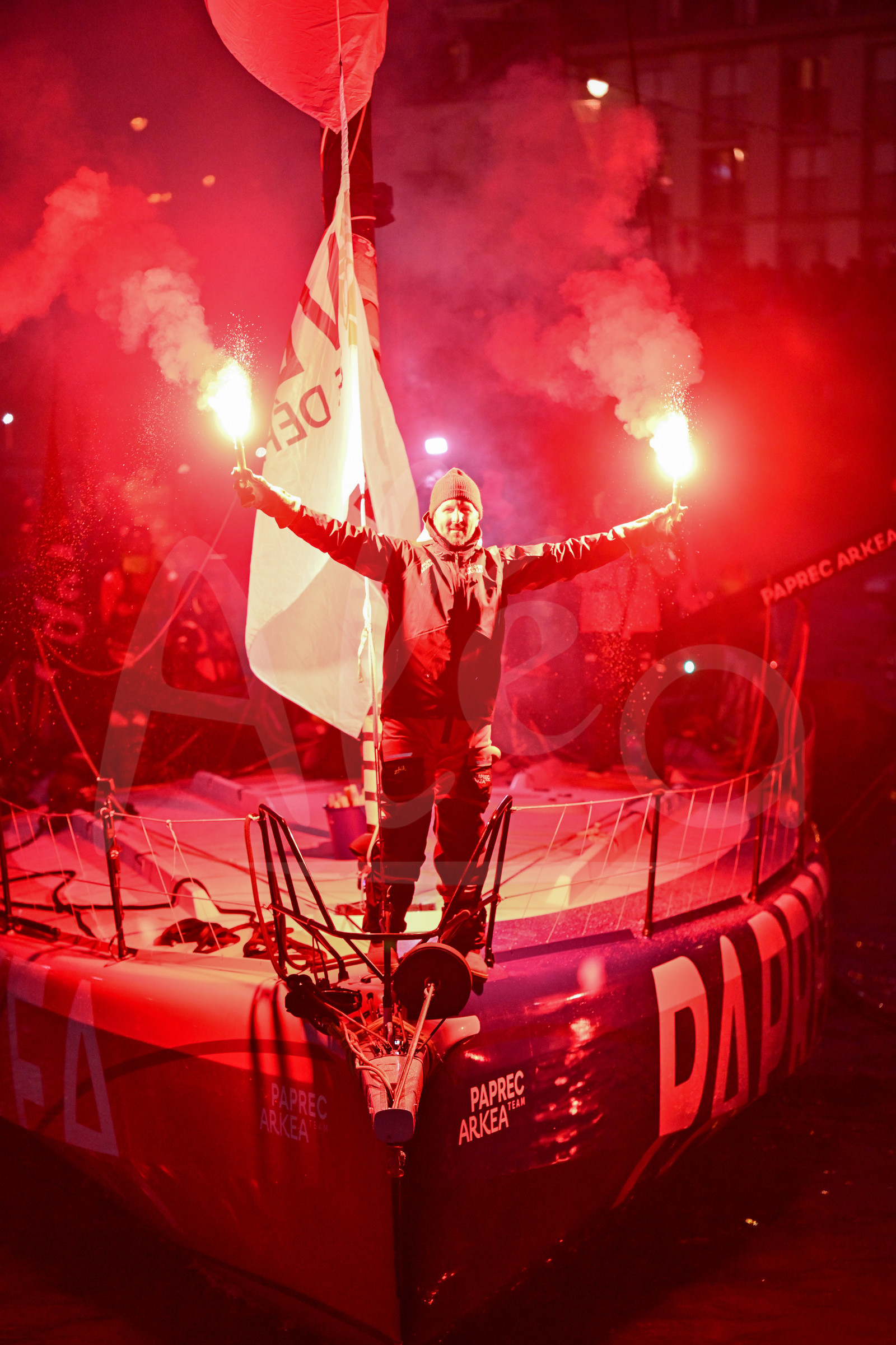 | Description | LES SABLES D'OLONNE, FRANCE - JANUARY 15, 2025 : PAPREC ARKÉA skipper Yoann Richomme (FRA) is photographed celebrating with flares in the channel after taking 2nd place in the Vendee Globe, on January 15, 2025 in Les Sables d'Olonne, France - (Photo by Jean-Louis Carli / Alea) |