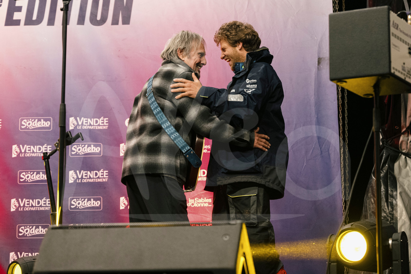 | Description | LES SABLES D’OLONNE, FRANCE - FEBRUARY 03, 2025 : Monnoyeur - DUO for a JOB skipper Benjamin Ferré (FRA) is photographed on stage with the singer Murray Head after taking 16th place in the Vendee Globe, on February 03, 2025 in Les Sables d'Olonne, France - (Photo by Olivier Blanchet / Alea) |