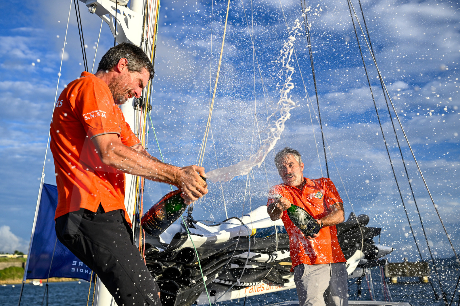 | Description | FORT-DE-FRANCE, MARTINIQUE : Class 40 SNSM.ORG Faites un don, skippers Corentin Douguet and Axel Trehin, celebrate with champagne arriving second in their category of the Transat Café l'OR 2025 on November 17, 2025 in Fort-de-France, Martinique. (Photo by Jean-Louis Carli / Alea) |