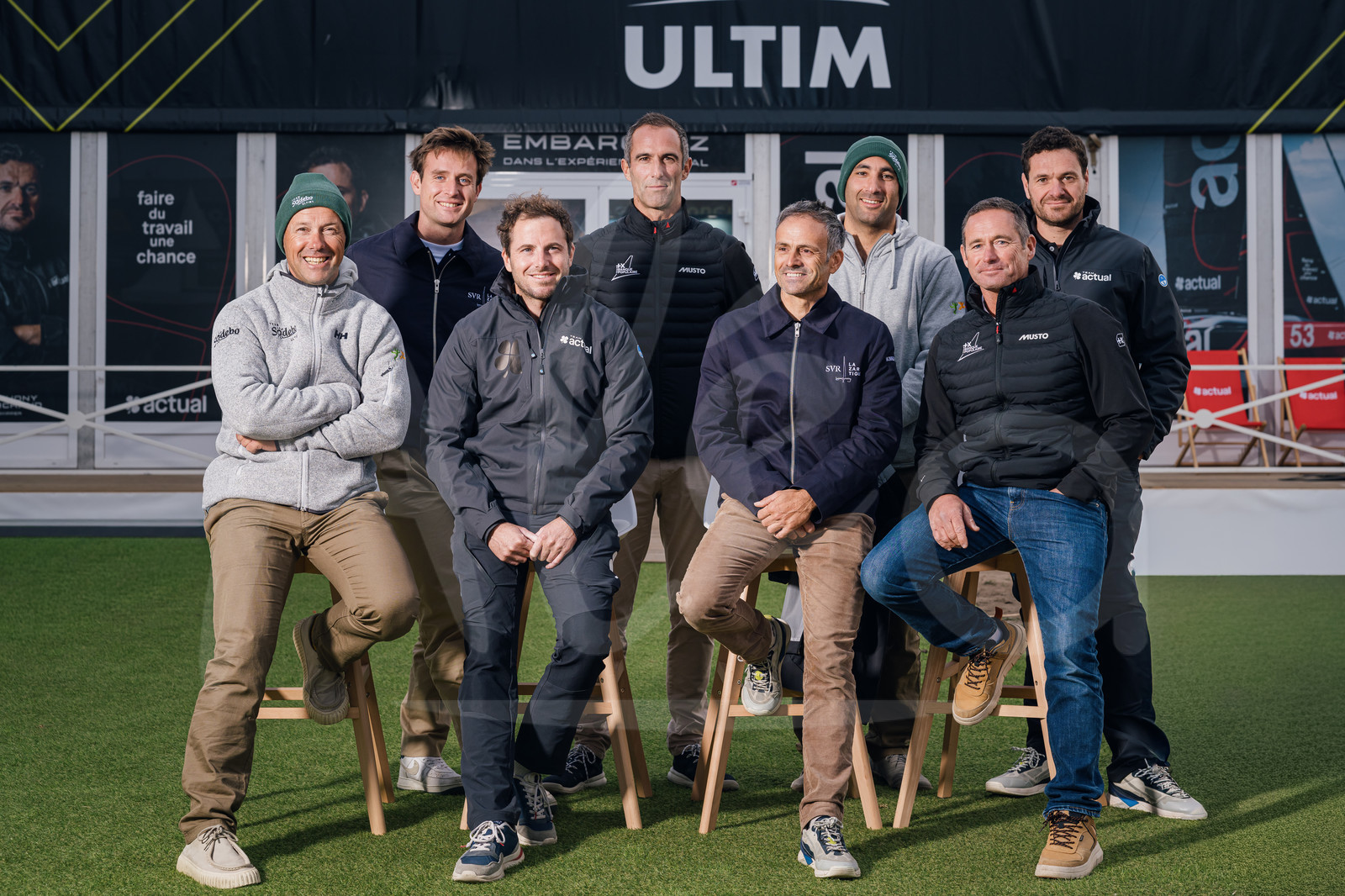 | Description | The Ultim Sodebo Ultim 3 skippers Thomas Coville and Benjamin Schwartz, SVR-Lazartigue skippers Tom Laperche and Franck Cammas, Maxi Banque Populaire XI skippers Armel Le Cleac'h and Sebastien Josse, Actual Ultim 4 skippers Anthony Marchand and Julien Villion, are photographed at the Transat Café L’Or village in Le Havre, France, on October 18, 2025. (Photo by Jean-Louis Carli / Alea) |