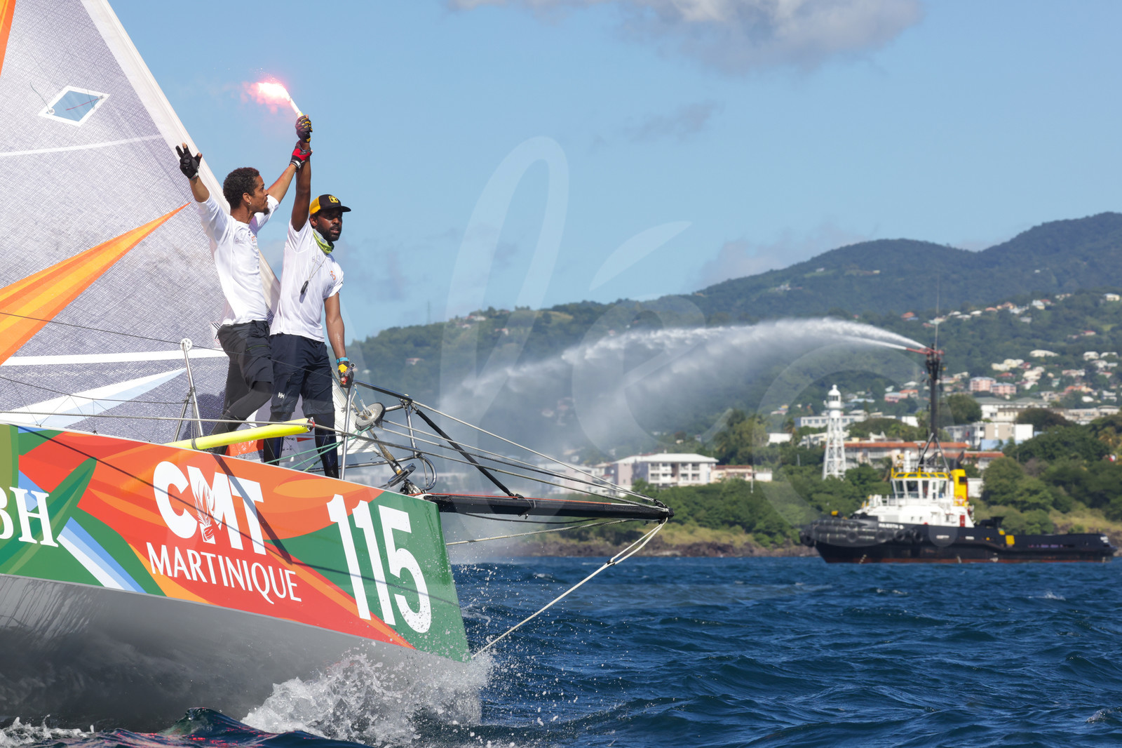 | Description | FORT-DE-FRANCE, MARTINIQUE : Class 40 Martinique Horizon, skippers Jean-Yves Aglae and Moane Mangatalle celebrate taking 34th place of leg 2 in their category of the Transat Café l'OR 2025 on November 23, 2025 in Fort-de-France, Martinique. (Photo by Georgia Schofield / TCO25) |
