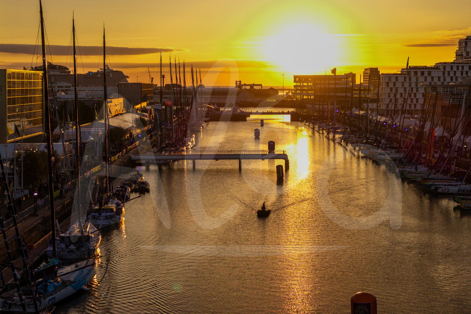 The boats are photographed at dusk before the Transat Café L’Or in Le Havre, France, on October 17, 2025. (Photo by Jean-Marie Liot / Alea)