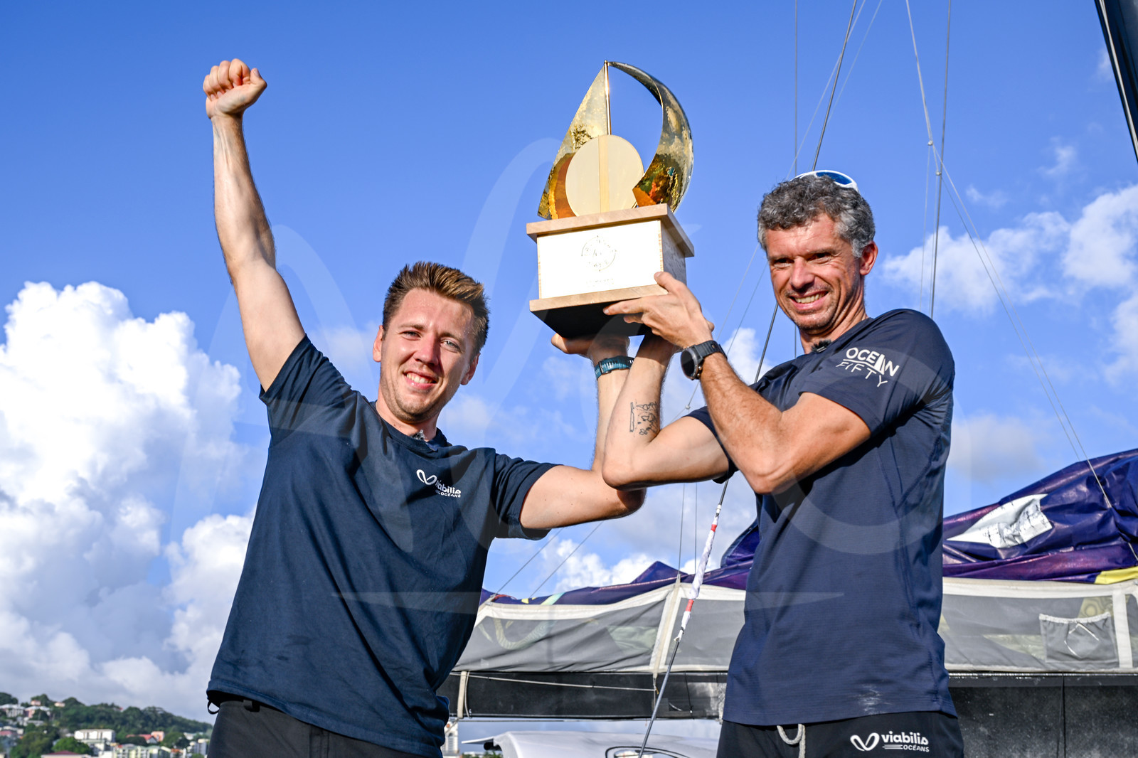 | Description | FORT-DE-FRANCE, MARTINIQUE : Ocean Fifty Viabilis Océans, skippers Baptiste Hulin and Thomas Rouxel celebrate winning their category of the Transat Café l'OR 2025 on November 6, 2025 in Fort-de-France, Martinique. (Photo by Olivier Blanchet / Alea) |