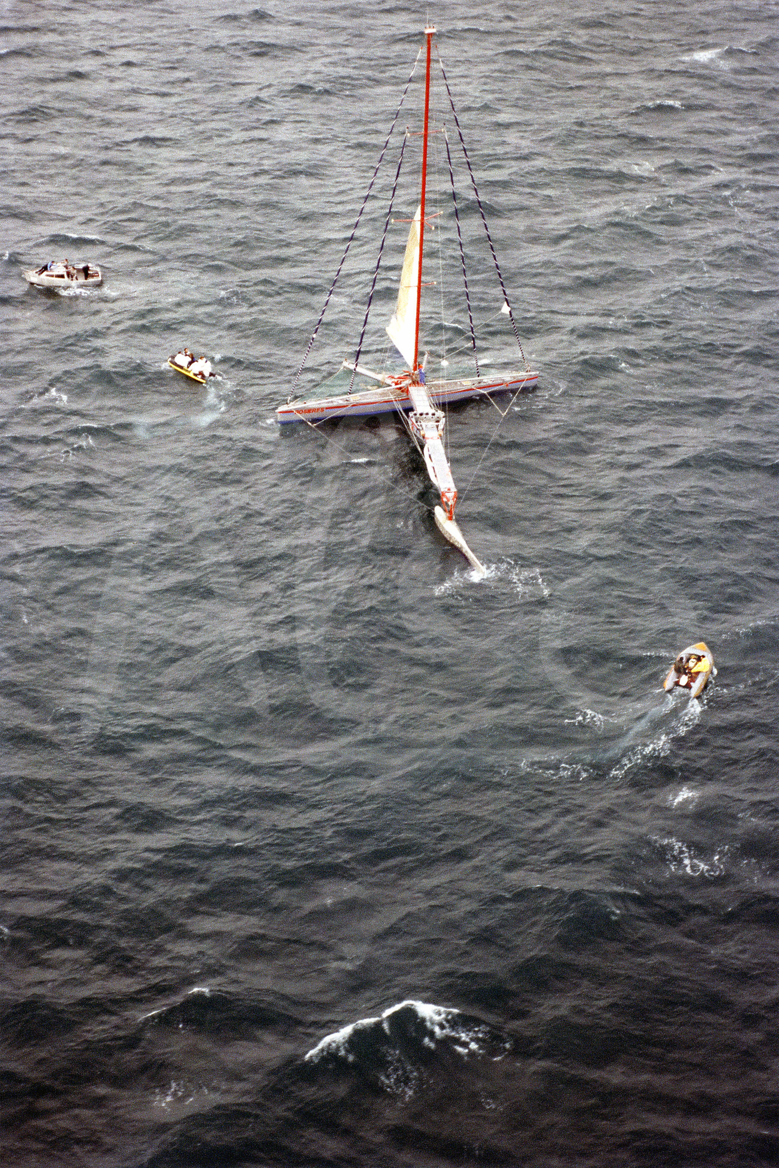 | Description | SAILING - TRANSATLANTIC RACE - ROUTE DU RHUM HISTORY - SAINT MALO (FRA) START - PHOTO : Bernard Rubinstein / ALEA ROUTE DU RHUM 1982 - PRAO PACIFIC ROSIERES / SKIPPER : GUY DELAGE (FRA) - CAPSIZED FEW SECONDS BEFORE THE START . |