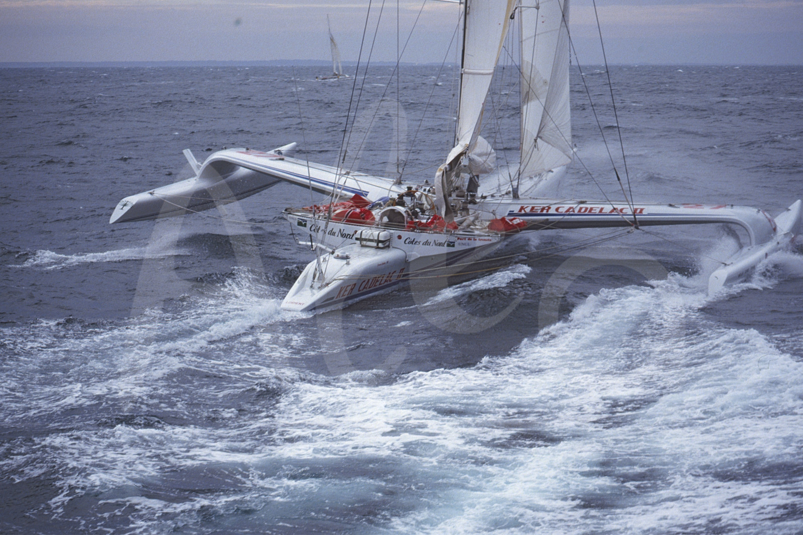 | Description | Skipper François Boucher, trimaran Ker Cadelac II, pendant le départ de la Route du Rhum, à Saint-Malo, Bretagne, le 9 Novembre 1986 - Photo Bernard Rubinstein / ALEA |