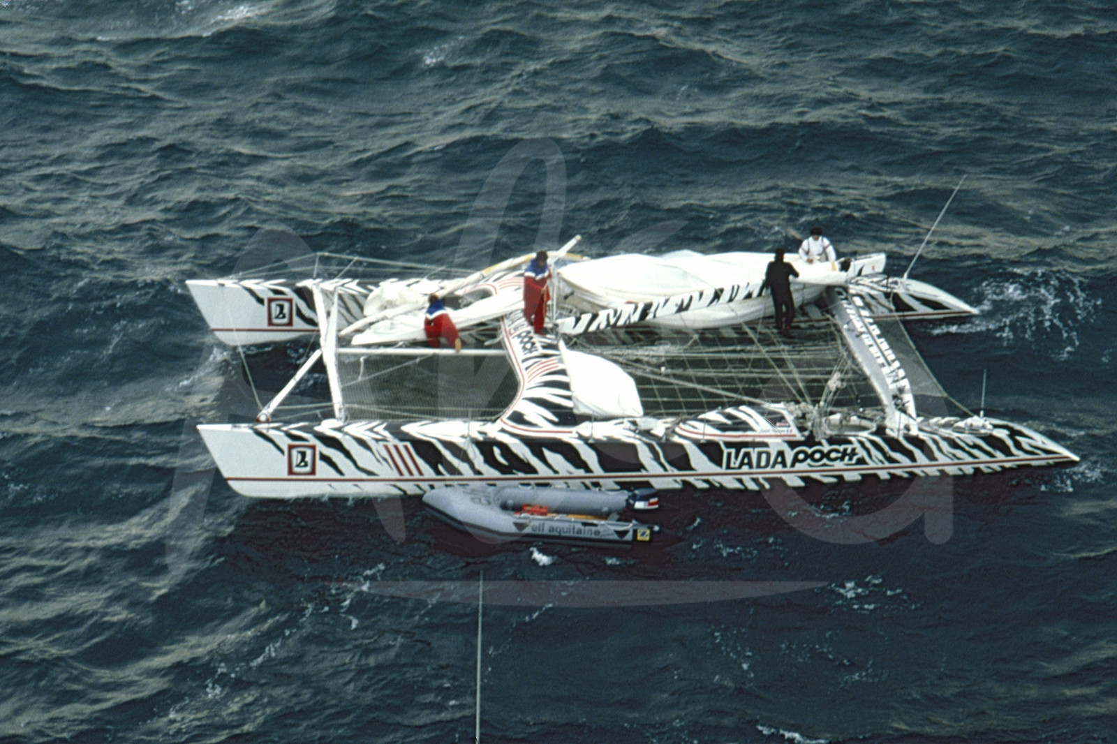 | Description | Skipper Loick Peyron, dématage (dismasting) du catamaran Lada-Poch, pendant le départ de la Route du Rhum, à Saint-Malo, Bretagne, le 9 Novembre 1986 - Photo Bernard Rubinstein / ALEA |