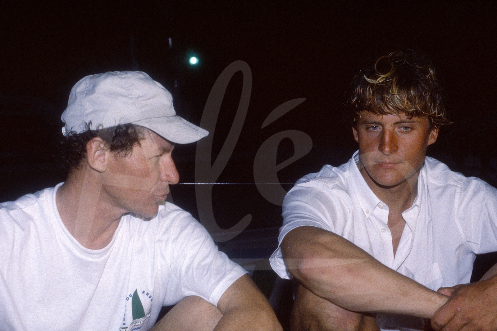 | Description | Laurent Bourgnon et Philippe Poupon discutent ensemble à l'arrivée de la Route du Rhum, à Pointe A Pitre, Guadeloupe, le 19 Novembre 1990 - Photo Bernard Rubinstein / ALEA |