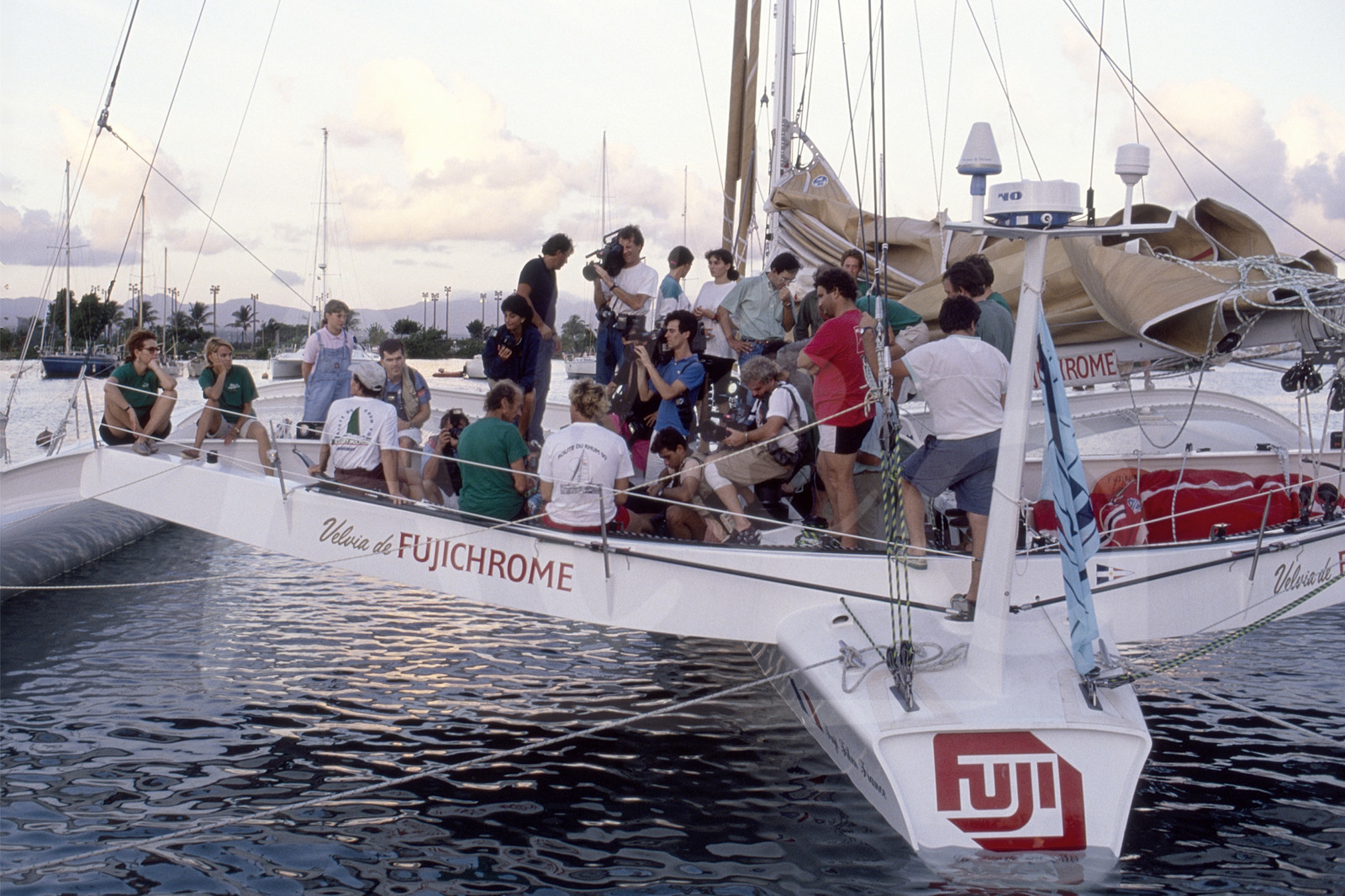 | Description | Laurent Bourgnon, Mike Birch et Philippe Poupon ensemble avec la presse sur le trimaran de Birch, Fujichrome, à l'arrivée de la Route du Rhum, à Pointe A Pitre, Guadeloupe, le 19 Novembre 1990 - Photo Bernard Rubinstein / ALEA |